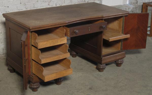 Die im Sitzbereich nach innen geschwungene große Deckplatte ist mehrfach profiliert, die Kassettierungen der Türfüllungen sind mit hochwertigen Appliken geschmückt und rahmen das schöne Furnierbild adäquat ein. Die mittlere Schublade mit ihren zwei fein gedrechselten Rosettenknäufen schließt sich stilistisch den hohen Füßen an. Das Innenleben ist mit seinen Schubladen und Einlegeböden funktional und hochwertig gestaltet.