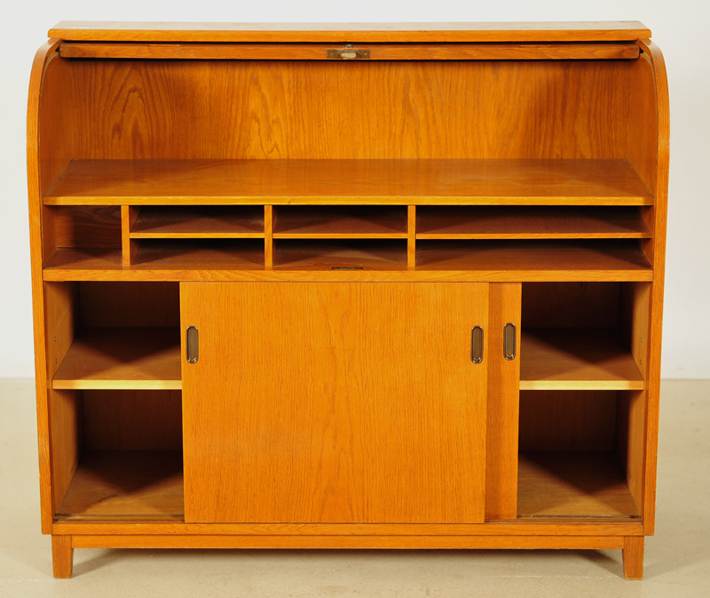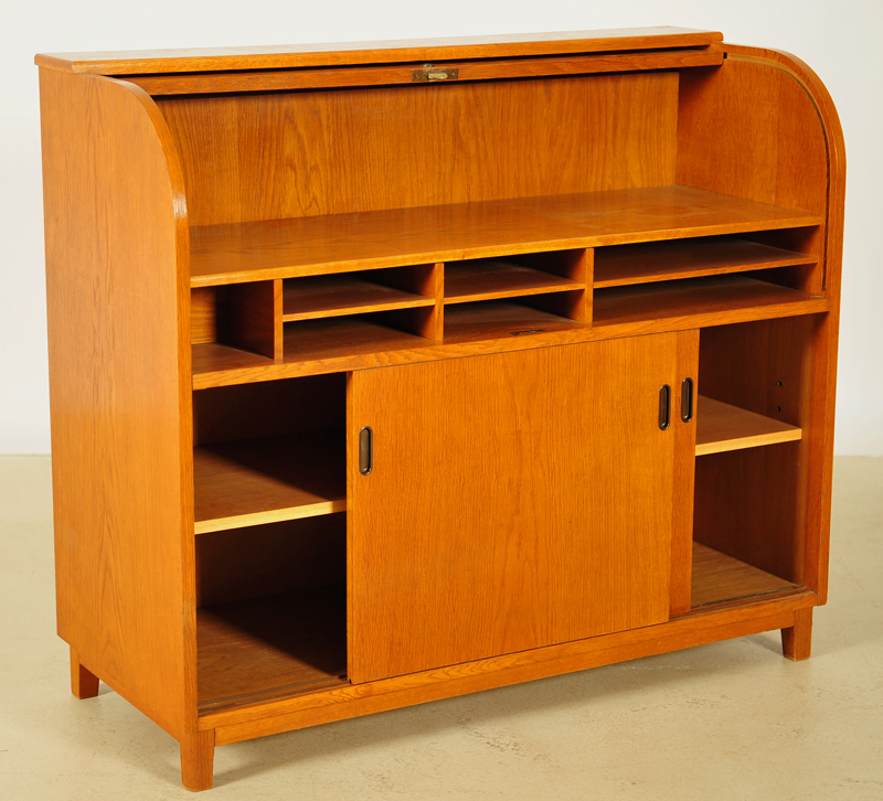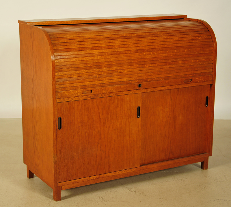Hier bieten wir Ihnen einen eindrucksvollen Rolladenschreibtisch an, der auf unnachahmliche Weise elegante Architektur mit höchster Funktionalität kombiniert. Er wurde in den 50/60er Jahren aus bester Eiche, massiv und furniert, gefertigt.