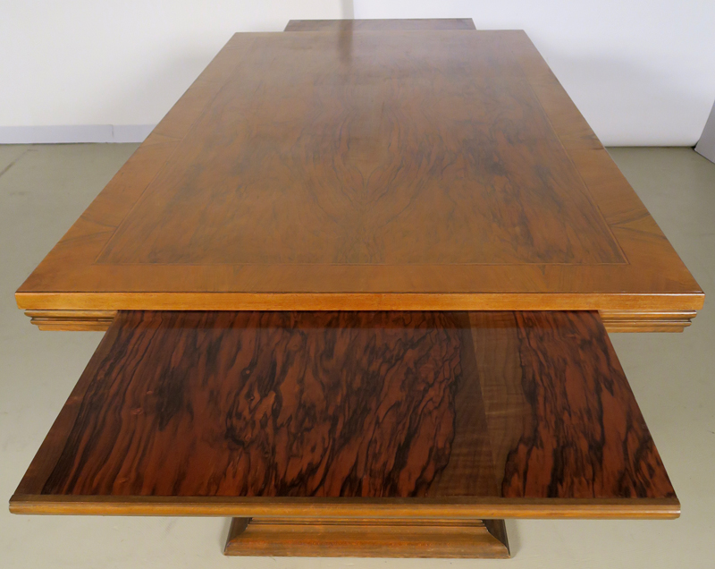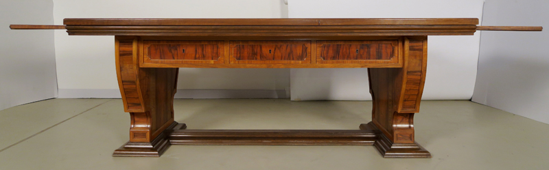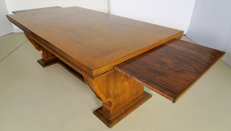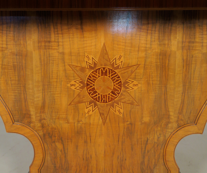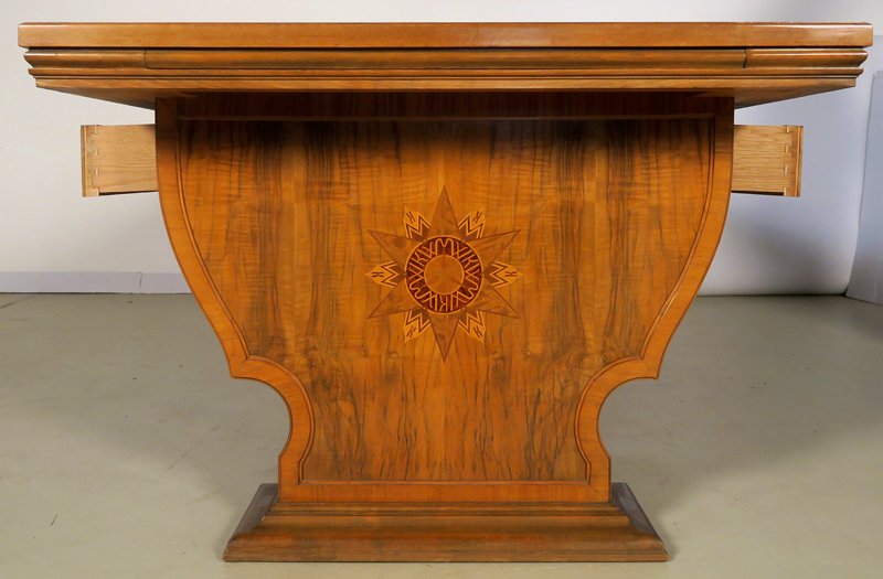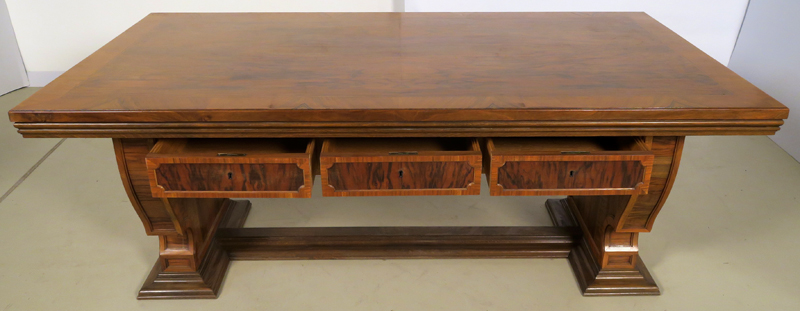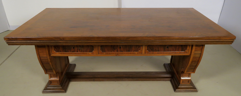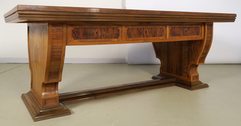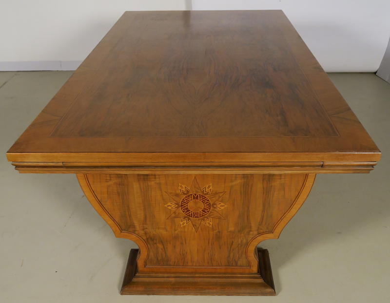 Er wurde um 1920 aus bestem Nussbaum, massiv und furniert gefertigt. Besonders hervorzuheben ist die identische Gestaltung der Vor- und Rückseite des Schreibtisches, die schönen Intarsien an den Seiten und das famose Furnierbild der Deckplatte in warmen Farbtönen. Die an beiden Seiten ausziehbaren Platten erweitern den Arbeitsbereich enorm.