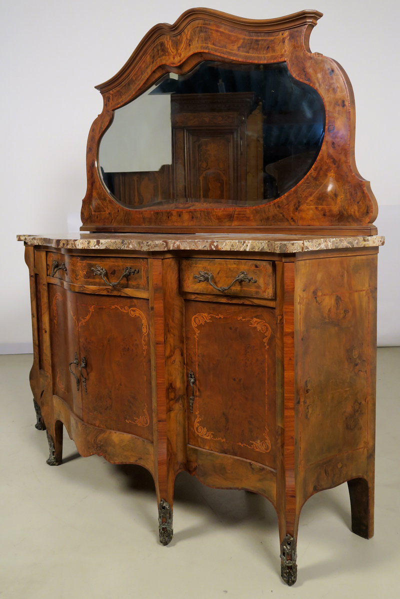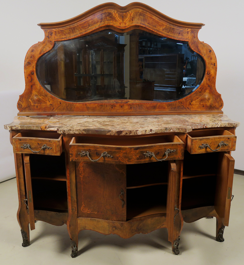 Hier offerieren wir Ihnen eine wundervolle Anrichte aus dem herrschaftlichen Neobarock. Um die Jahrhundertwende aus feinstem Nussbaum, massiv und furniert, gefertigt, begeistert diese Anrichte durch ihre einzigartige Gestaltung und zauberhaften Details.