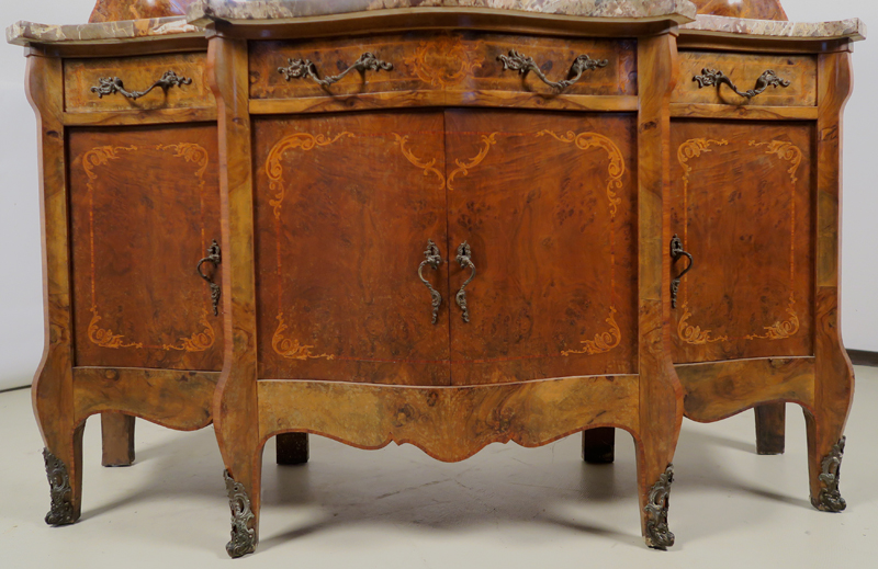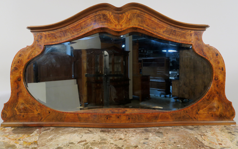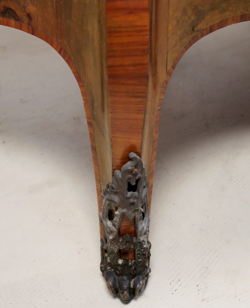 Das traumhafte Furnierbild wird von meisterlichen Einlegearbeiten in Form floraler Ornamentik geschmückt und ist an allen Bereichen des Möbels anzutreffen. Weiter gefallen die verspielten Einfassungen des Spiegels, der geschweifte Giebel, die hochwertige Marmorplatte sowie die fantastischen Beschläge.