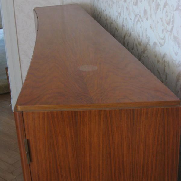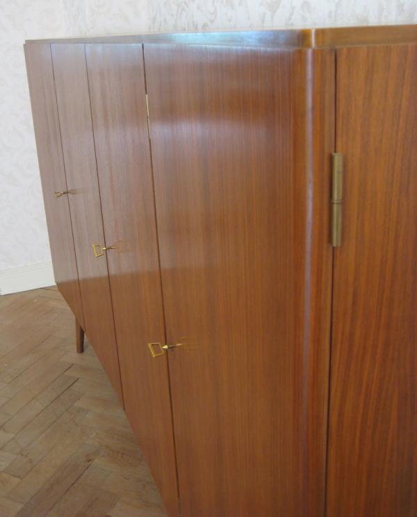 Besonders hervorzuheben ist die nach innen geschwungene Front, die vier, von innen nochmals gegenfurnierte Türen sowie die vollständig vorhandenen und profilierten Einlegeböden.