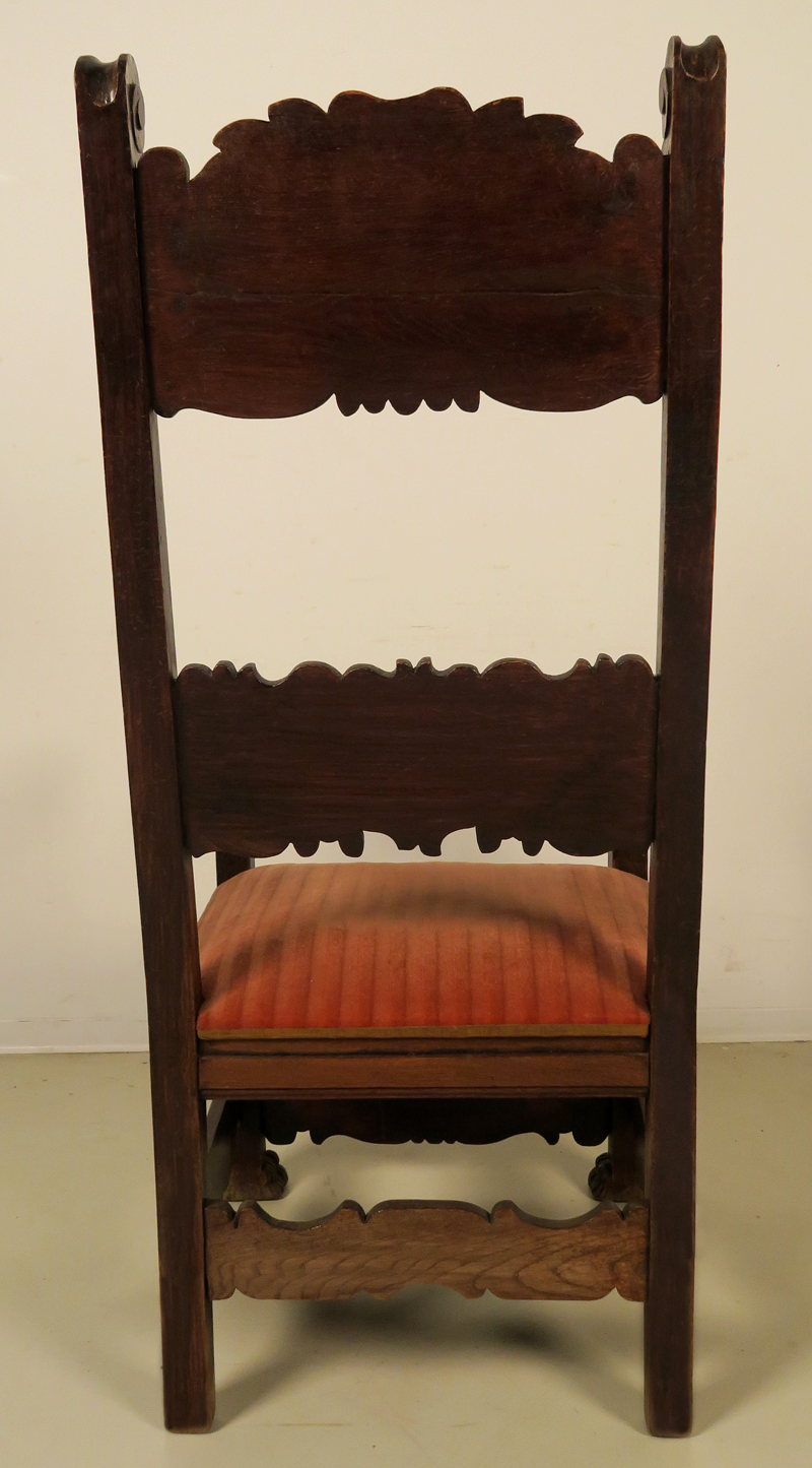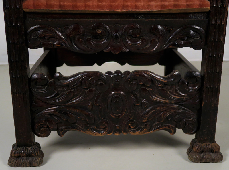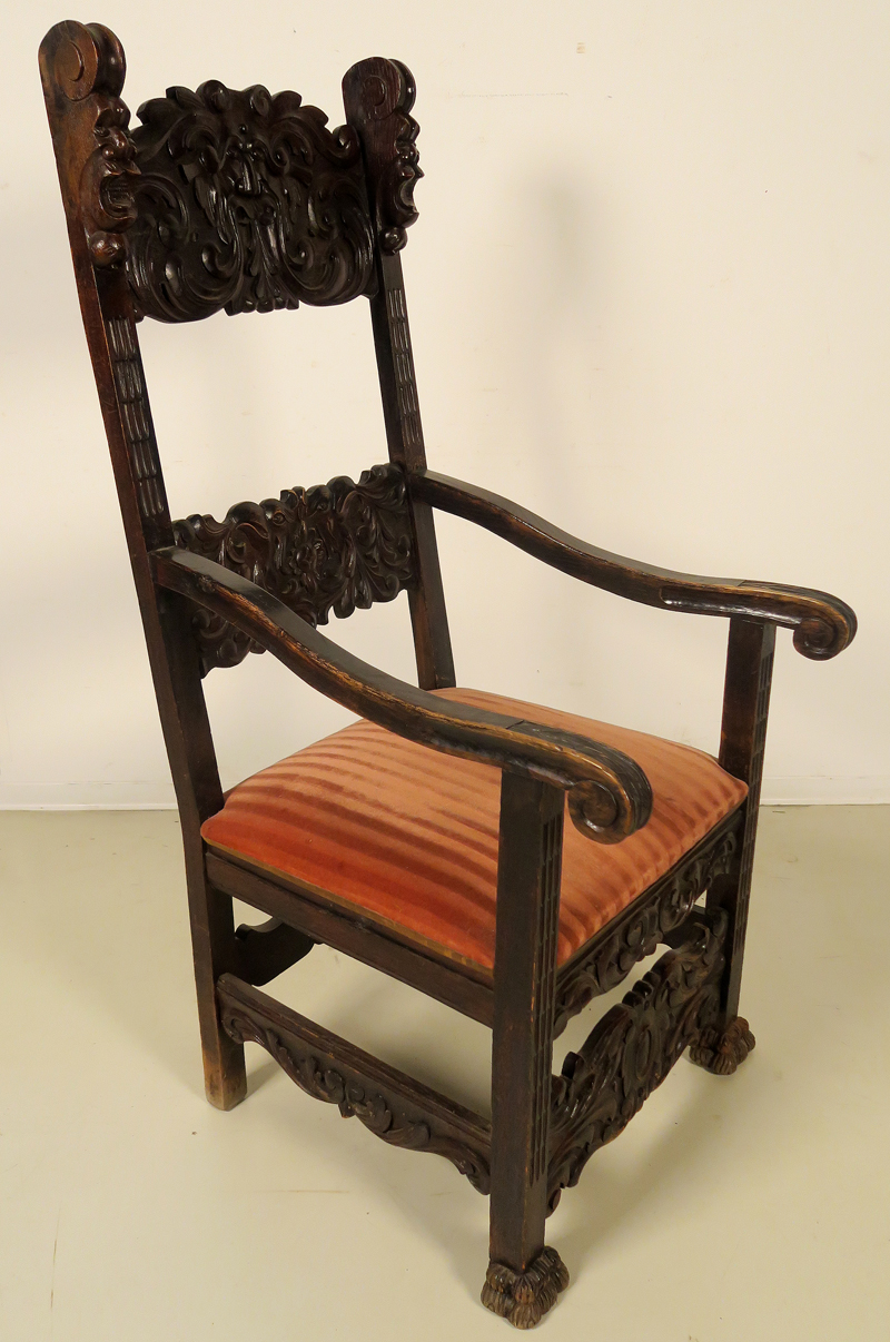 Besonders hervorzuheben ist der Verbindungssteg des Fußkreuzes mit seinem unglaublichen floralen Schnitzereien, die geschnitzte Rückenlehne mit Löwenkopf, Krone und Blattranken, geschneckten Knäufen und Armlehnen, Tatzenfüßen sowie dem Schuppenfries an Beinen und Lehnen.