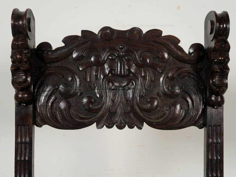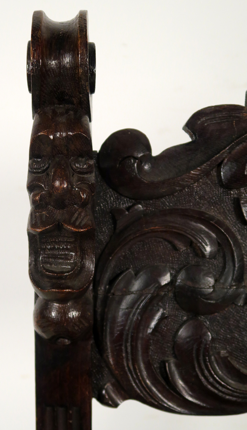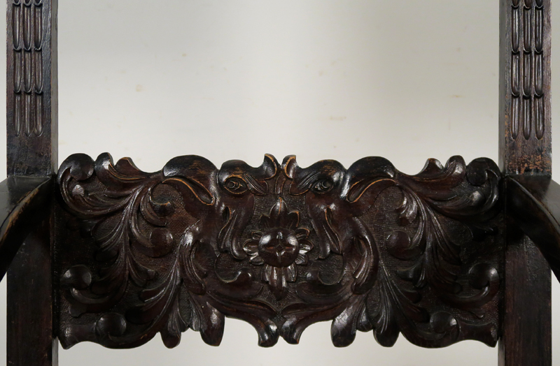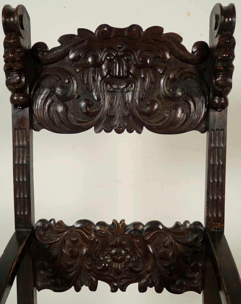 Heute bieten wir Ihnen einen bemerkenswerten Armlehner aus dem Historismus an, der um 1880 aus bester Eiche, massiv und furniert, gefertigt wurde. Seine Architektur und Linienführung, insbesondere aber die wunderschönen Schnitzereien machen ihn zu einem überwältigenden Exponat dieser Stilepoche.