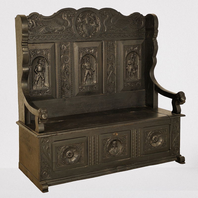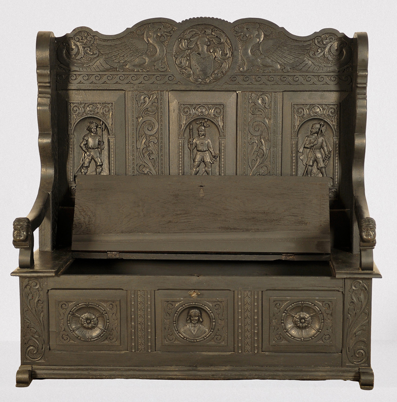 Besonders hervorzuheben sind bei dieser Hallenbank sicherlich die vollfigürlichen Darstellungen, die handgeschnitzt von detailgetreuer und anmutiger Gestalt sind. Im oberen Abschluss der hohen Rückenlehne wird ein reich verziertes Herrschaftswappen von zwei kräftigen Drachen eingerahmt. Darunter befinden sich drei Kassetten mit plastischen Figuren in Form mittelalterlich gestalteter Kämpfer. Zierendes Beiwerk in floraler Ornamentik umgibt die Kassetierungen und findet sich ebenfalls am Sitzkasten mit seinem zu öffnenden Deckel. Die Front des Unterteils ist abermals dreigeteilt, zwei große Rosetten flankieren einen fein herausgearbeitetenden Männerkopf.