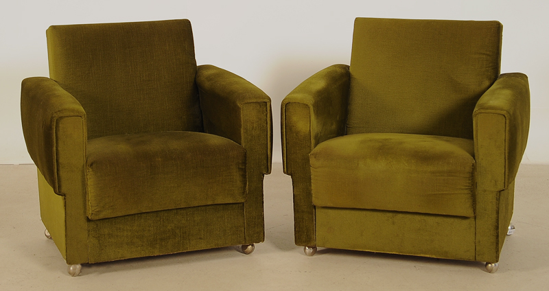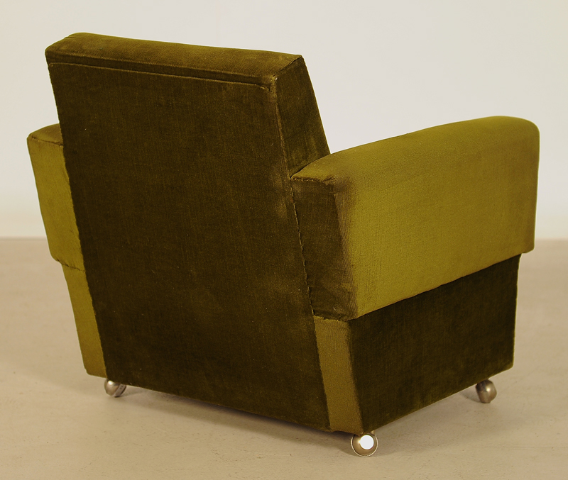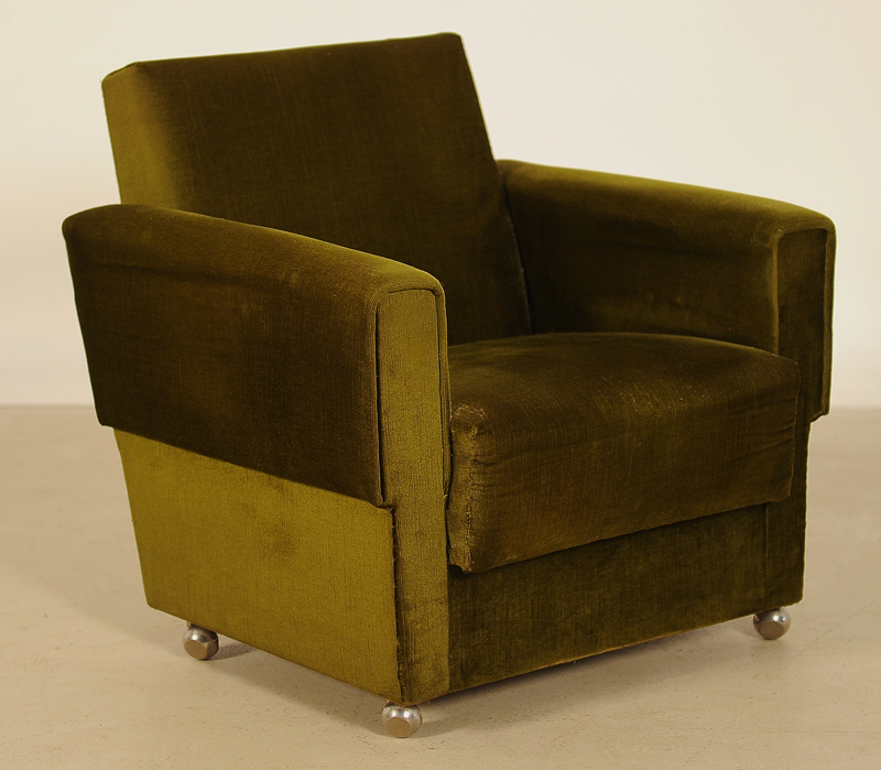 Die Polster wurden mit grünem Velours bezogen und befinden sich in einem gutem Zustand.