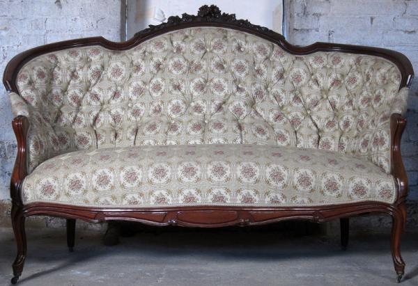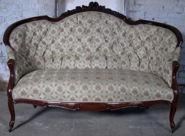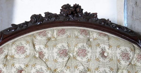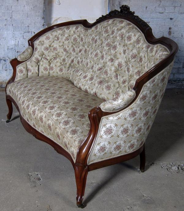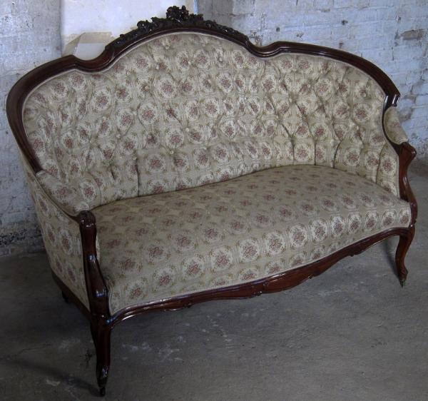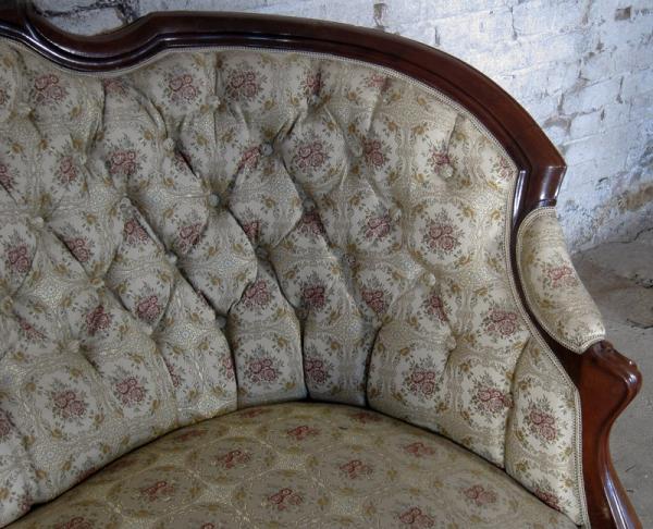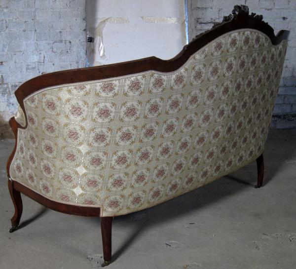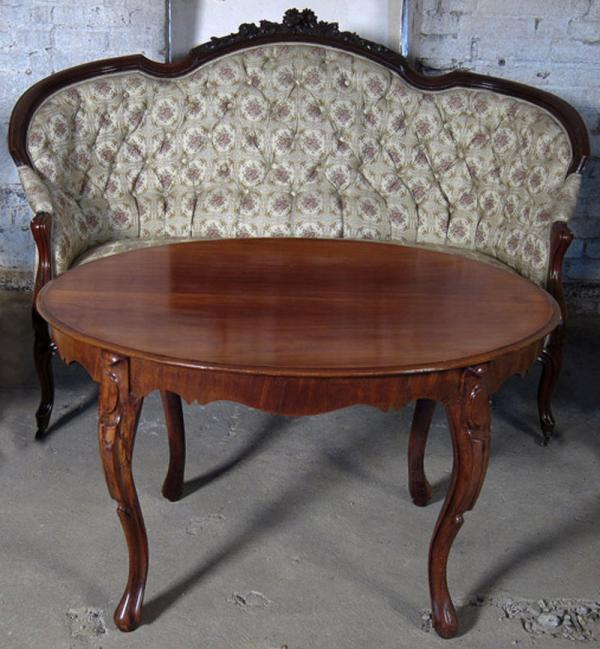 Auf dem Sofa befindet sich ein Brandstempel mit Krone und den Initialen WPH. Dieses Kürzel steht für Wilhelm Prinz von Hessen. Die aus einem Schloß stammenden Möbel sind meisterlich verarbeitete, hochqualitative Möbel. Besonders begeistern die zauberhaft geschwungene Form, schön zu sehen an den Lehnen und den Beinen, das äußerst aufwändig gestaltete Furnierbild der Deckplatte des Tisches, die geometrisch interessant gestaltete Gliederung und die ehrwürdige und originale Patina!