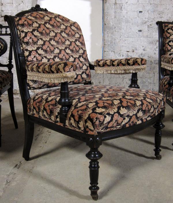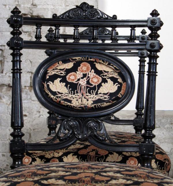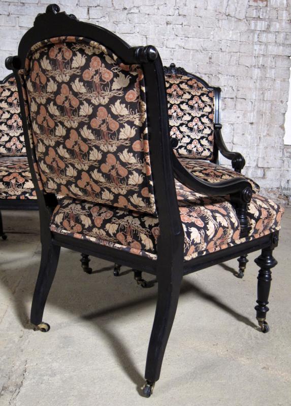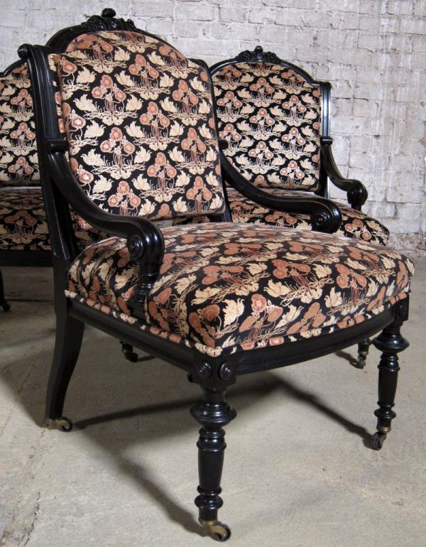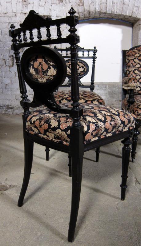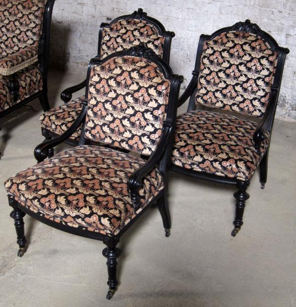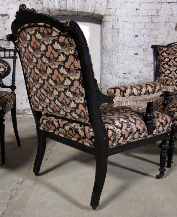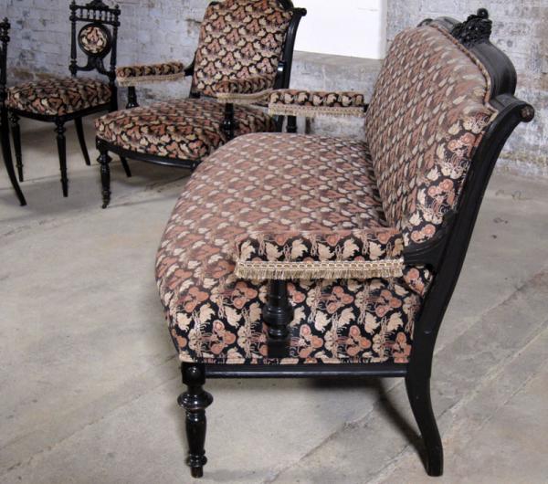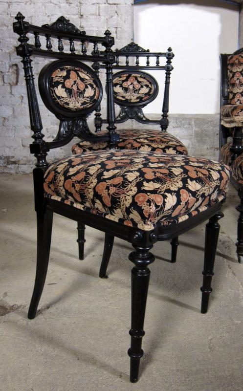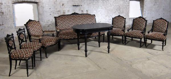 Hier können wir Ihnen wieder einmal ein sensationelles Ensemble aus der faszinierenden Gründerzeitepoche anbieten. Es handelt sich dabei um eine 8-teilige, ebonisierte Sitzgruppe von 1880, die durch ihren unwahrscheinlichen Facettenreichtum und ihre meisterliche Fertigung überwältigende Eleganz ausstrahlt.