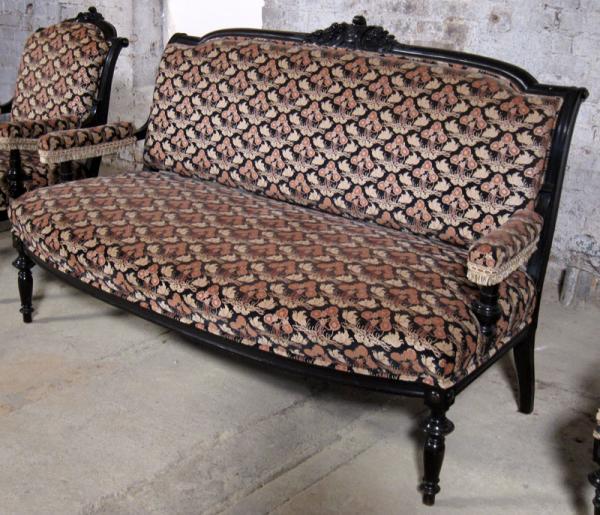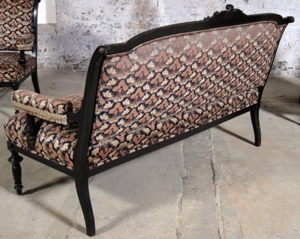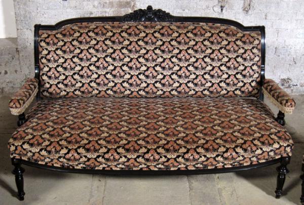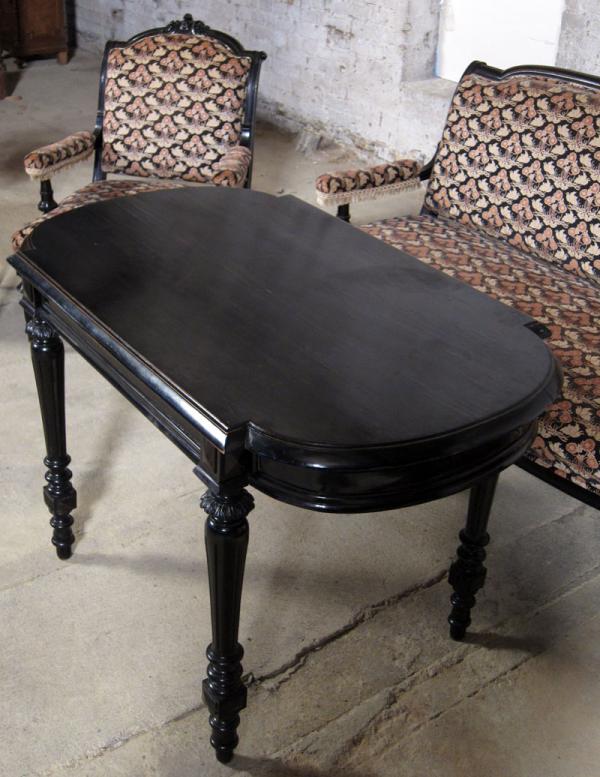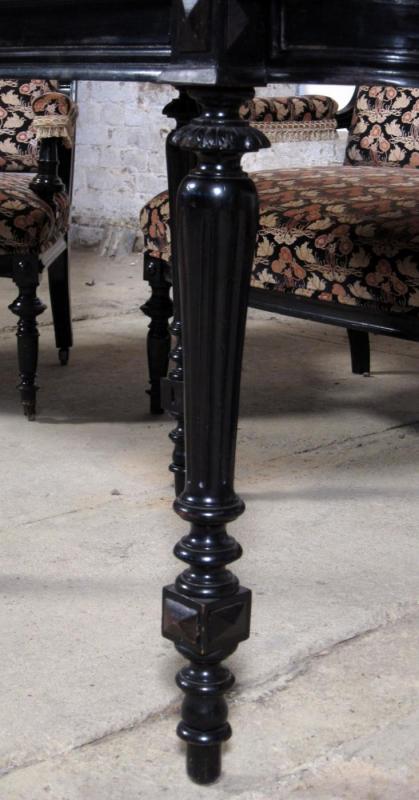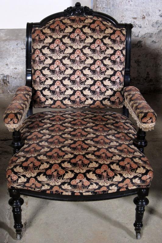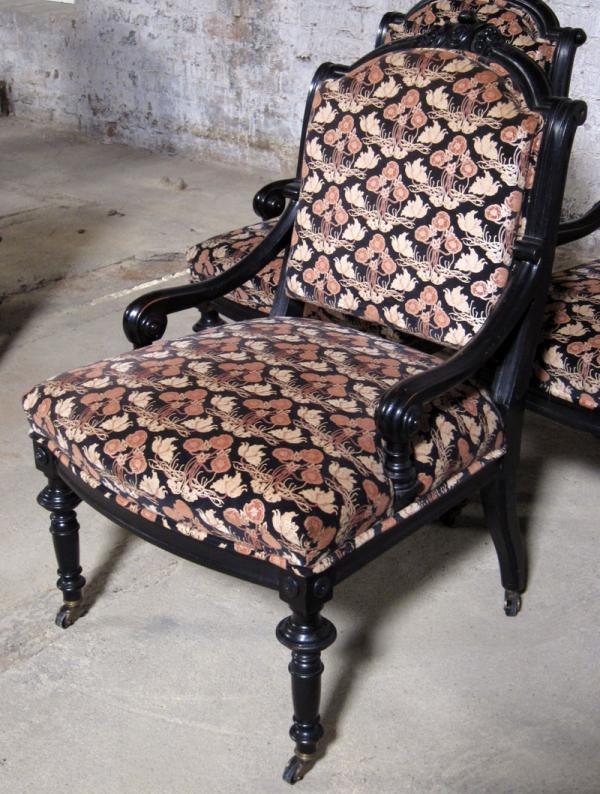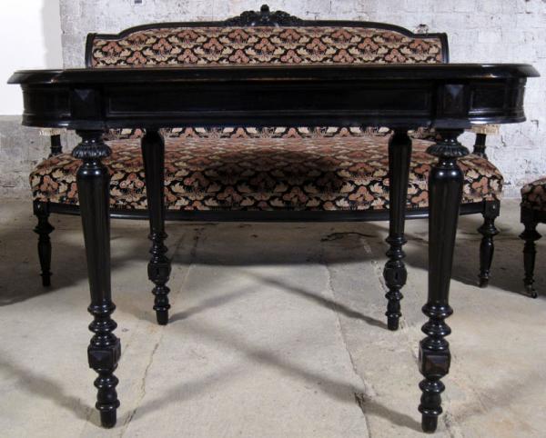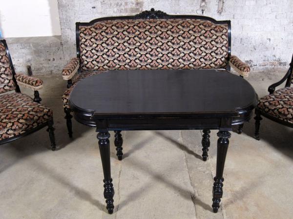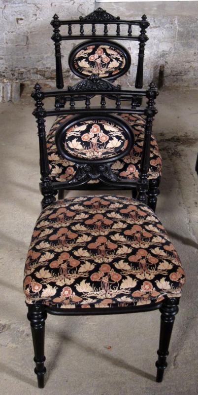 Hier können wir Ihnen wieder einmal ein sensationelles Ensemble aus der faszinierenden Gründerzeitepoche anbieten. Es handelt sich dabei um eine 8-teilige, ebonisierte Sitzgruppe von 1880, die durch ihren unwahrscheinlichen Facettenreichtum und ihre meisterliche Fertigung überwältigende Eleganz ausstrahlt.