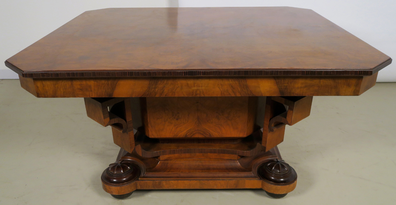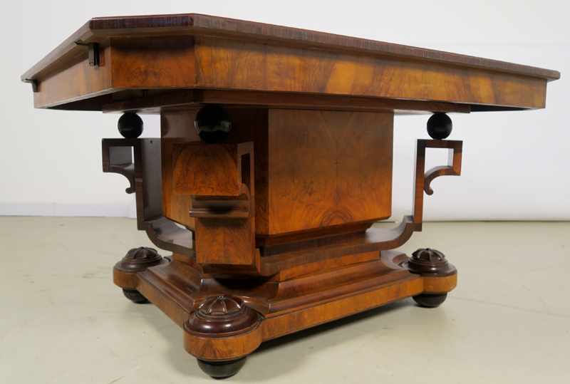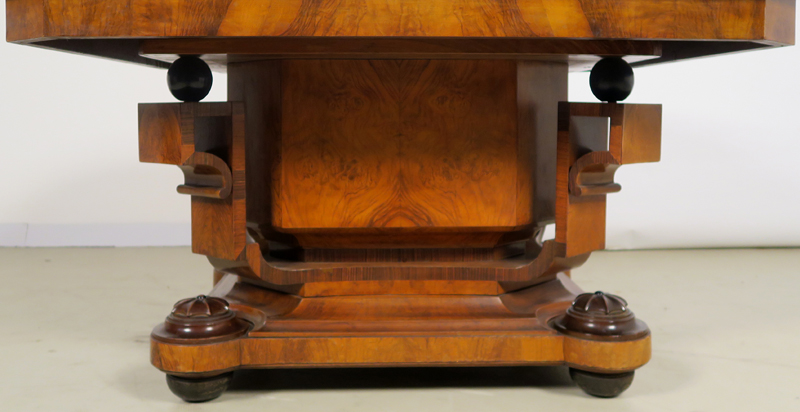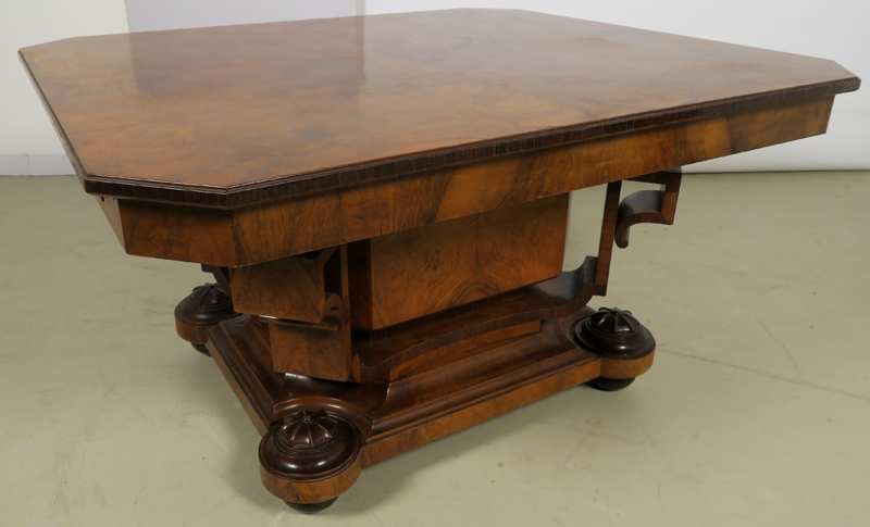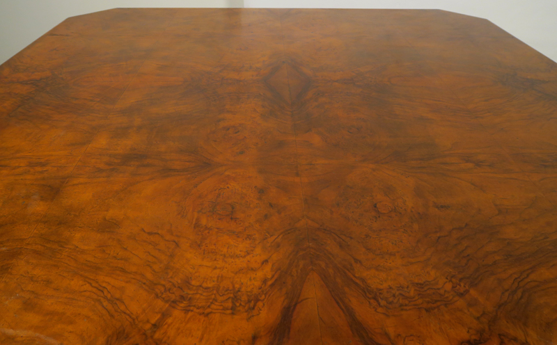 Heute dürfe wir Ihnen wieder einmal eine so faszinierende wie aussergewöhnliche Sensation anbieten. Es handelt sich dabei um eine 7-teilige Sitzgruppe aus der stilprägenden Epoche des Art Deko, die in all ihrer Extravaganz ihre stilvolle Eleganz niemals aufgibt und durch ihre repräsentative Architektur nachhaltig begeistert. Es wurde um 1920 aus feinstem Nussbaum, massiv und furniert, gefertigt.