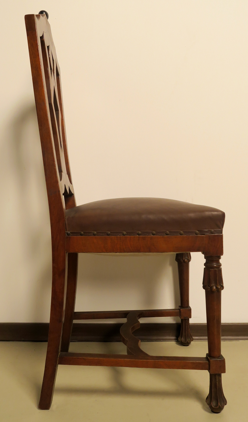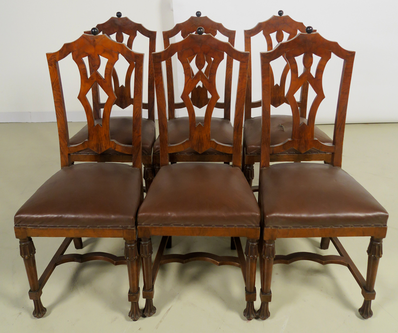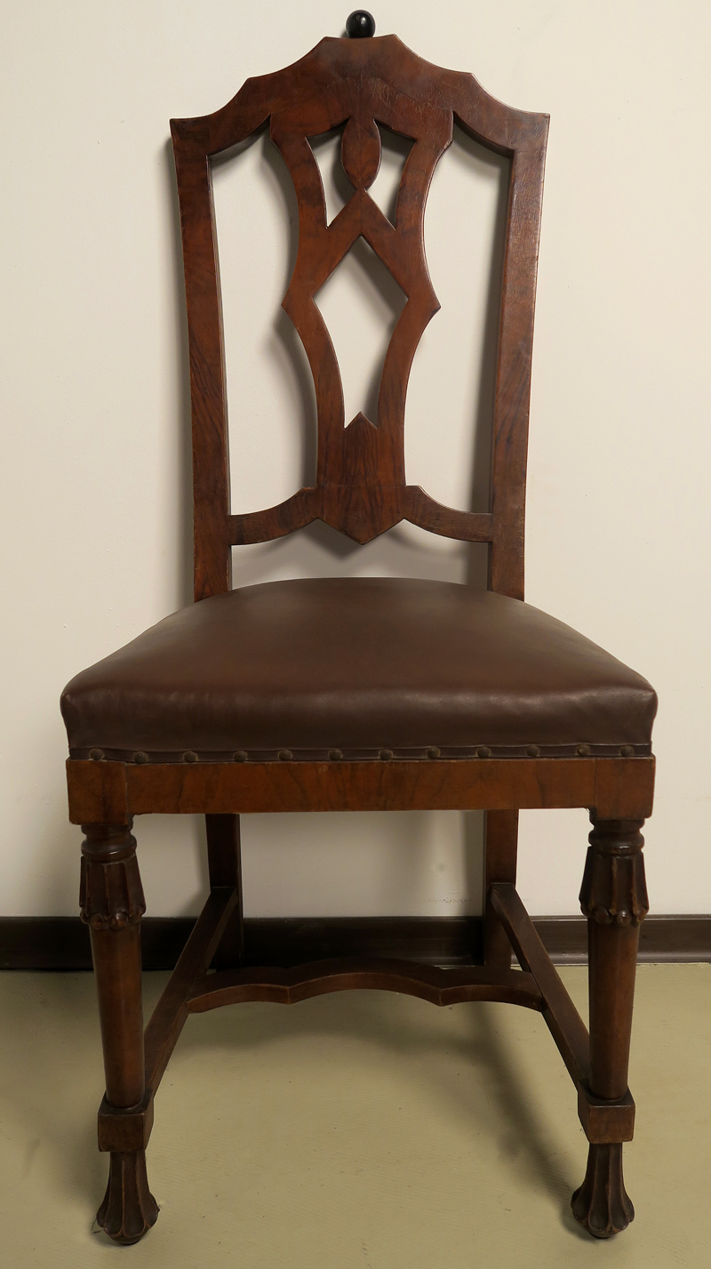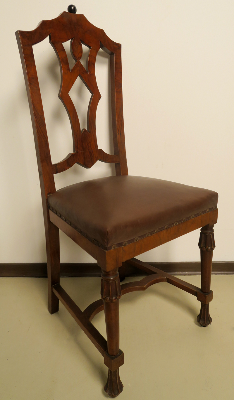 Die Schönheit dieses Ensembles ist kaum zu beschreiben. Die Einzelaufnahmen offenbaren jedes liebevoll entworfene Detail, besonders eindrucksvoll sind die unglaublichen Furnierarbeiten in unterschiedlichen Mustern und Farbnuancen, die gefächterten, an Muscheln erinnernden Elemente, die sich an jedem Stück wiederholenden Merkmale wie zum Beispiel die ebonisierten Kugeln oder die kubischen Teilstücke die schwerelos in der Luft zu schweben scheinen (besonders schön zu sehen am sagenhaften Esstisch). Die Stühle begeistern durch ihre interessant gestaltete Rückenlehne, die schön gegliederten Beine sowie dem hochwertigen Lederbezug.
