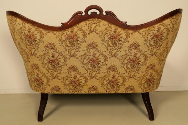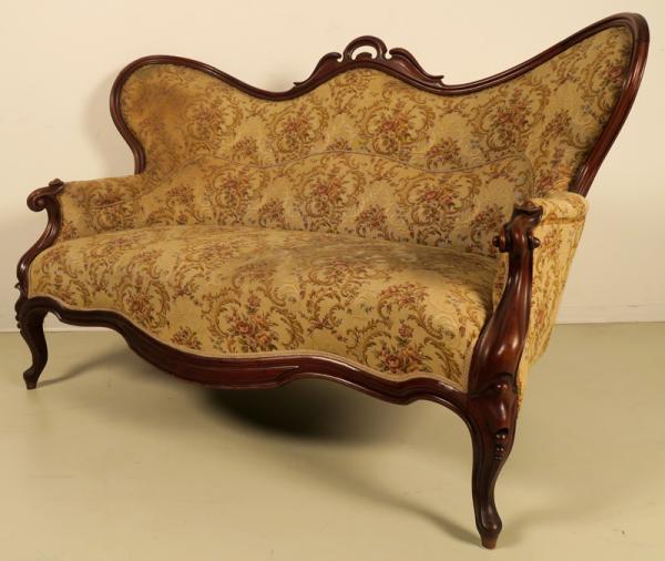 Wunderschöne, geschwungene Linienführung mit außergewöhnlich weit ausstehender Rückenlehne, der Korpus profiliert und mit kleiner Krönung versehen, fein geformte Beine und volutierende Armlehnen bilden hier die hervorstechendsten Merkmale.
