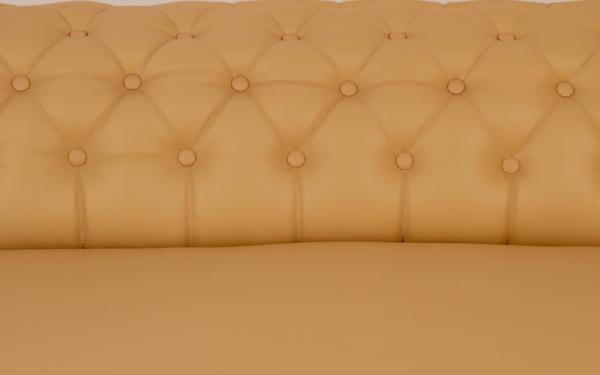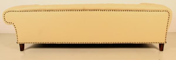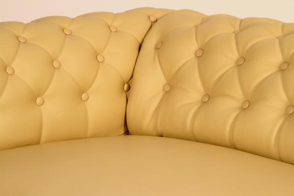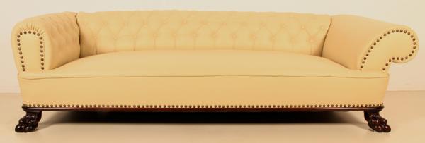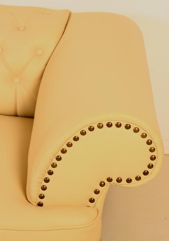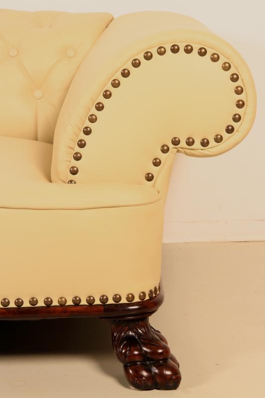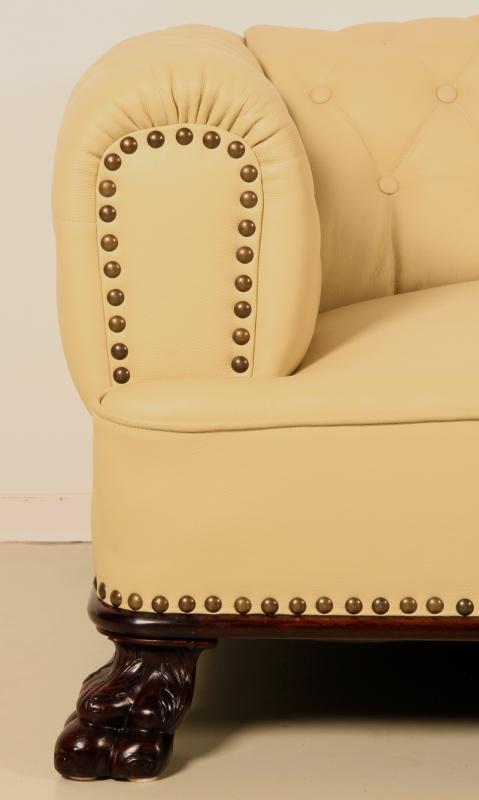 Auch holzvertäfelte Säle mit Kaminduft sind nicht zwingend ein Aufstellungskriterium, dieses wunderschöne Exponat bereichert durch seine herrschaftliche Ausstrahlung jede Einrichtung gleichermaßen. Edel schmiegt sich das fantastische Hirschleder in angenehmem Beige-Ton an die elegante Form des Sofas an. Die charakteristisch tief in die Polsterung eingezogenen Kapitonierungen und Ziernägel an der Vorderfront der Rücklehne und der linken Seitenlehne sind überaus klassisch. Die rechte Seitenlehne jedoch bricht mit der herkömmlichen Linienführung und gibt dem Möbel durch die Chaiselongue-Form ein extravagantes Design.