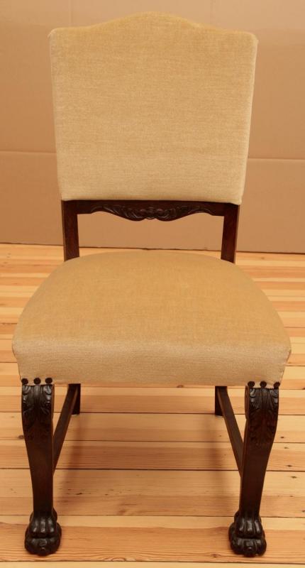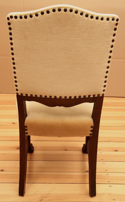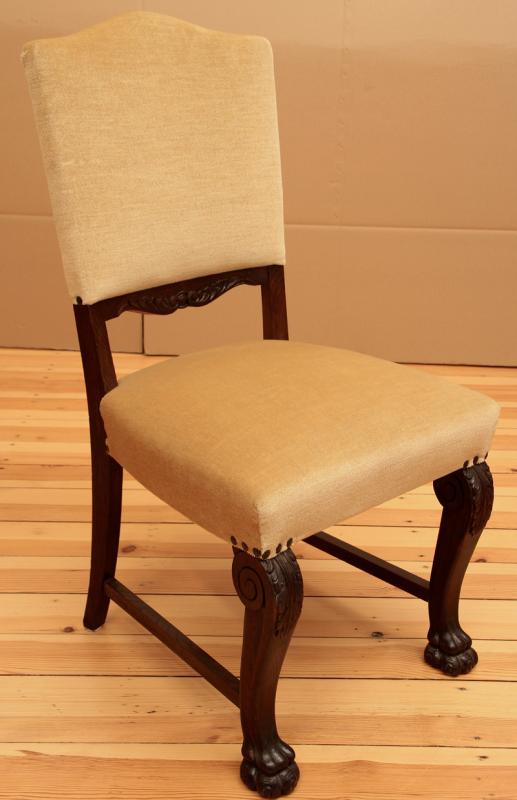 Hervorzuheben sind dabei vor allem die vorderen Beine mit Akanthusblatt-Appliken am oberen, volutierenden Schaft und die abschließenden, fein gearbeiteten Löwentatzenfüße. Profilierte Fußstege, nach hinten schwingende Säbelbeine, beschnitzte Mittelstege der Rückenlehnen sowie die hochwertige Polsterung mit klassischen Polsternägeln sind weitere Highlights dieser Exponate.