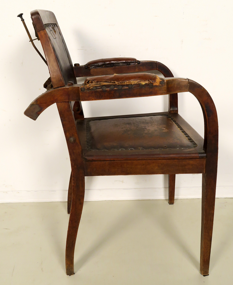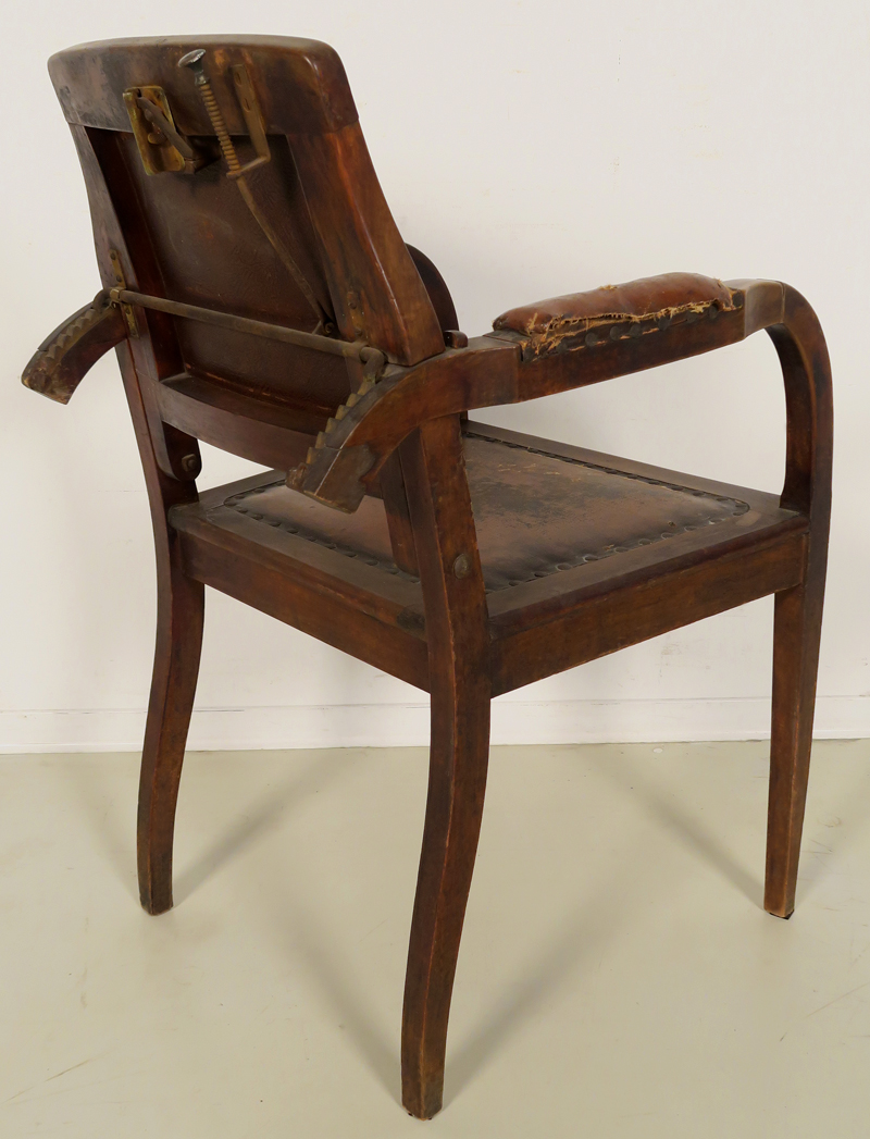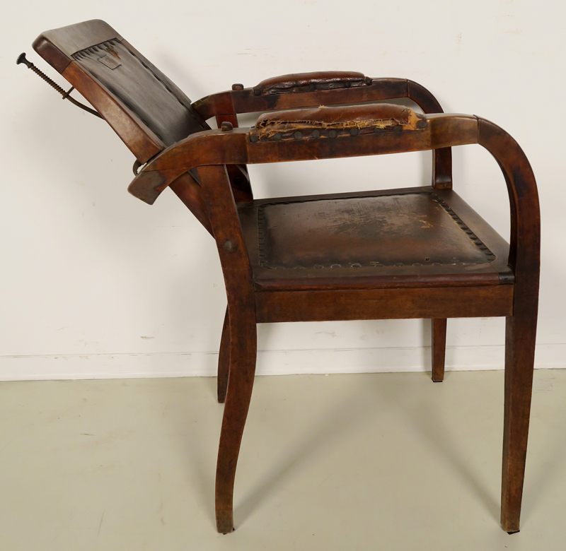 Hier bieten wir Ihnen einen sehr seltenen Friseurstuhl / Behandlungsstuhl aus dem Jugendstil, der in seiner eleganten, klaren Linienführung begeistert. Der Armlehner wurde um die Jahrhundertwende aus bestem Nussbaum, massiv und furniert, gefertigt.