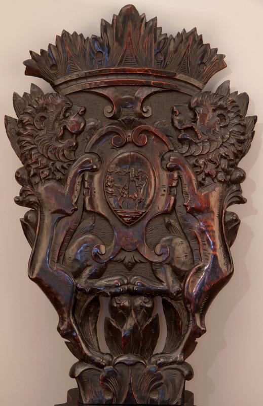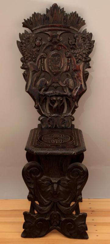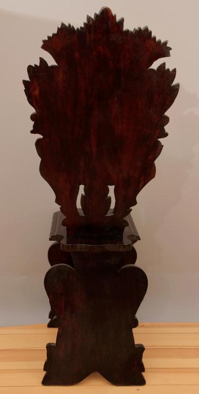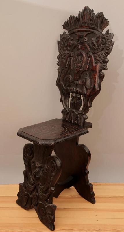 Hervorzuheben ist das komplette Schnitzwerk mit filigranen Elementen und herrschaftlichen Motiven. Besonders die Rückenlehne mit dem venezianischen Königswappen, den Stadtlöwen und der großen Krone begründen die repräsentative Ausstrahlung! Die Handwerkskunst wurde hier überaus sorgfältig und kleingliedrig ausgeführt. Auch die beschnitzte Sitzfläche und die Beinelemente mit eindrucksvollen Maskeronen fügen sich in das königliche Bild dieser Sgabbeli.