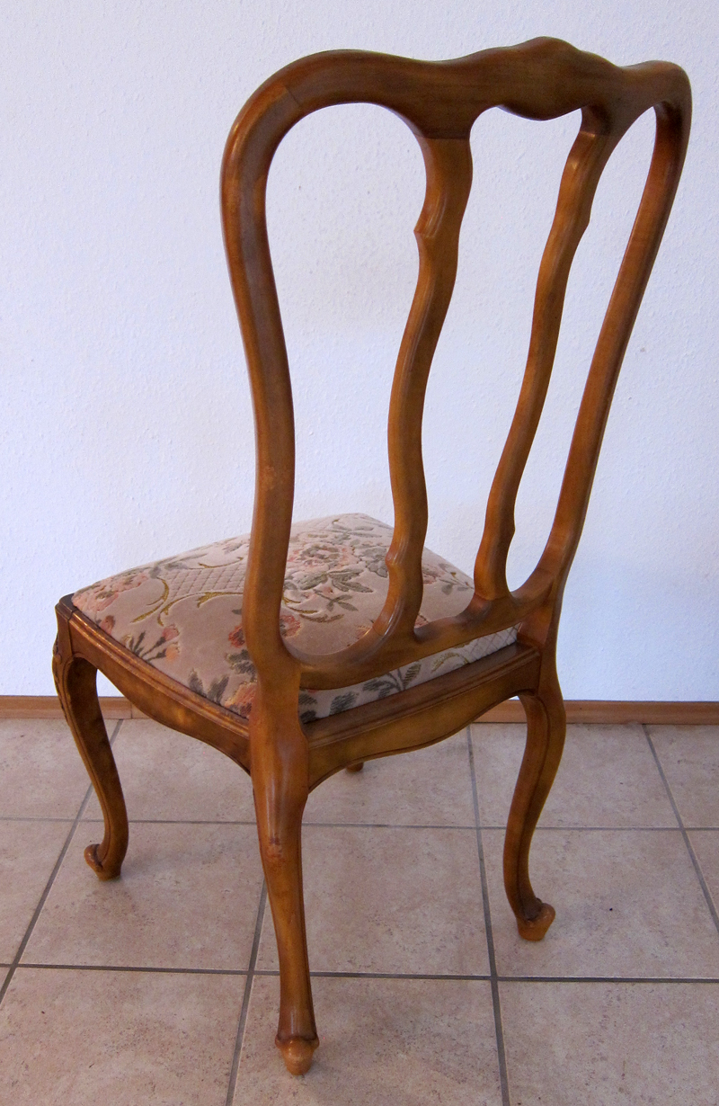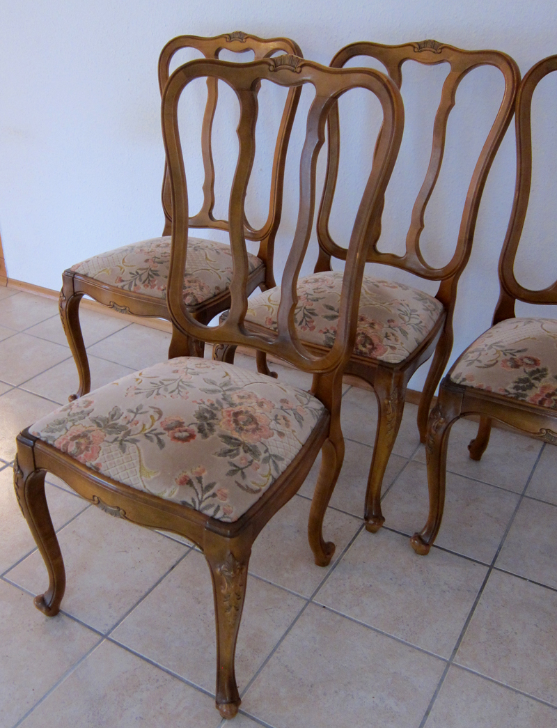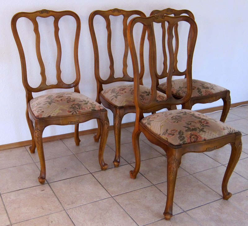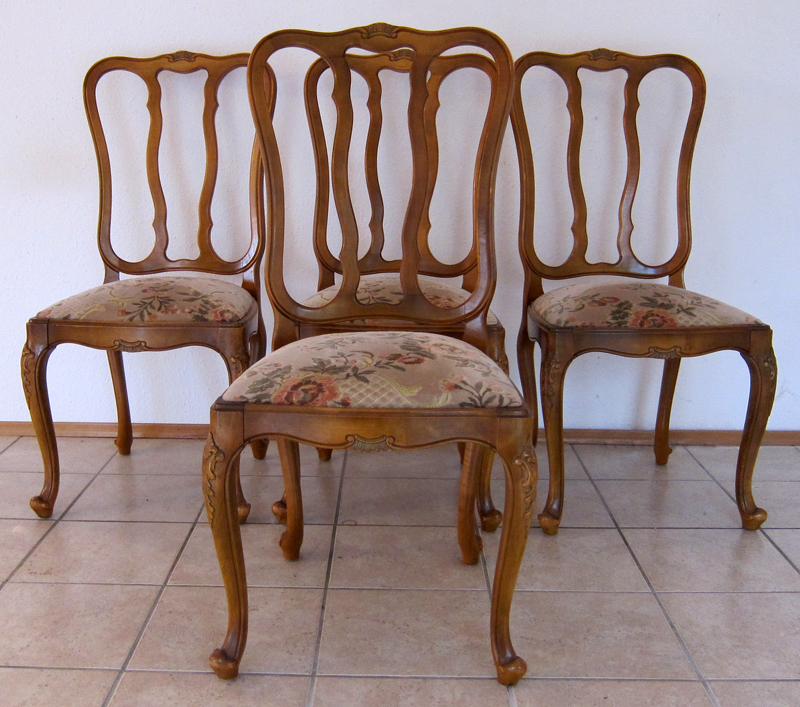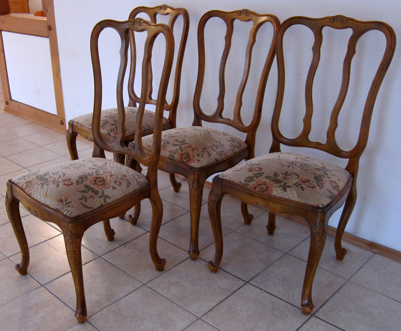 Seine elegant geschwungene Linienführung gepaart mit höchst qualitätsvoller Ausführung machen ihn zum Blickfang jeder Tafel. Die vier Stühle zeichnen sich durch ihre verspielte Rückenlehne, der breiten, geschwungenen Sitzfläche und den seitlich gestellten vorderen, geschwungenen Beinen aus.