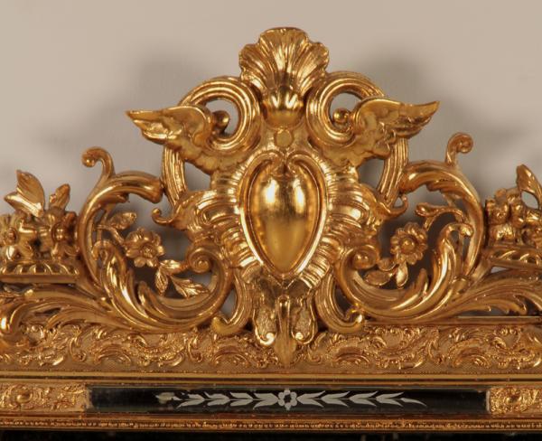 Hervorzuheben die traumhaft schöne Bekrönung mit Wappen und überbordender floraler Ornamentik sowie der komplett beschnitzte Rahmen mit ebonisierten Elementen.