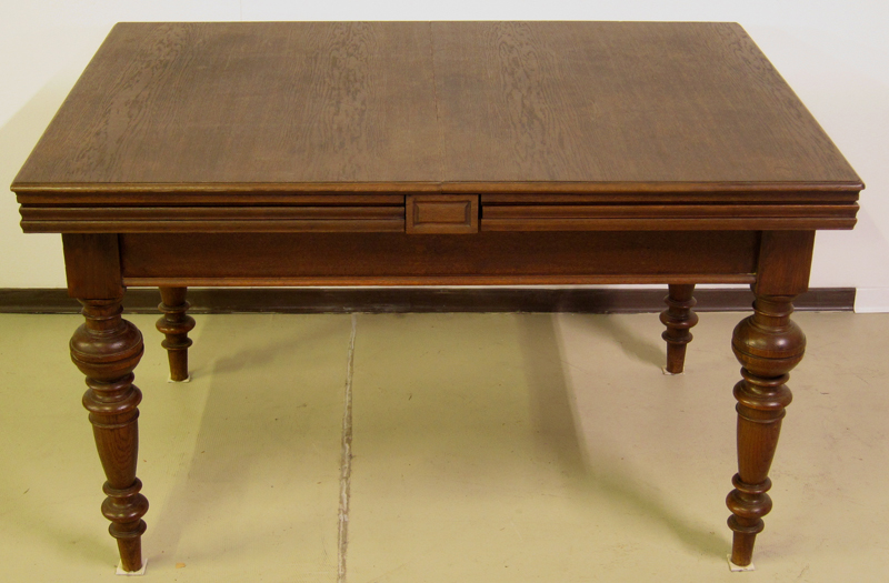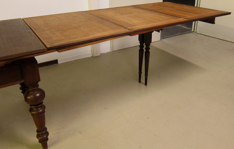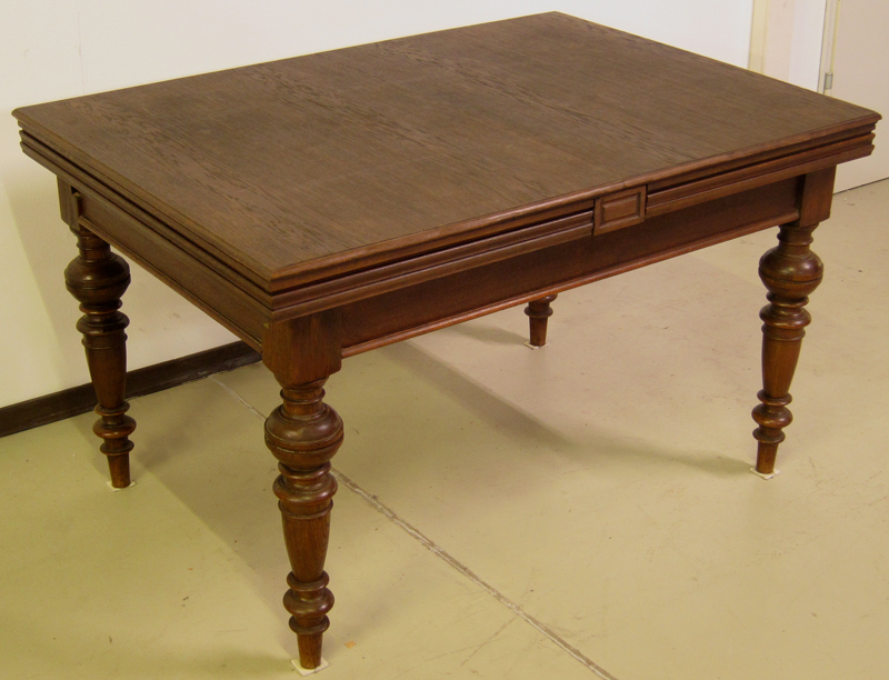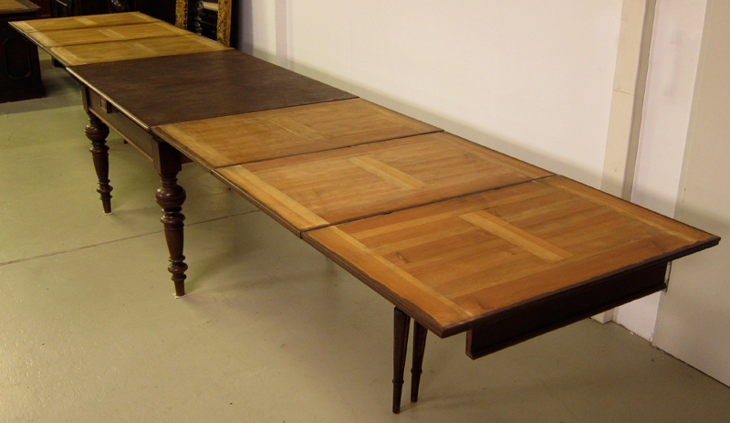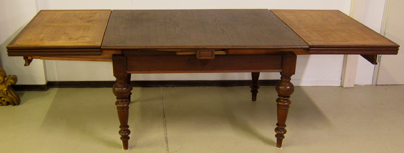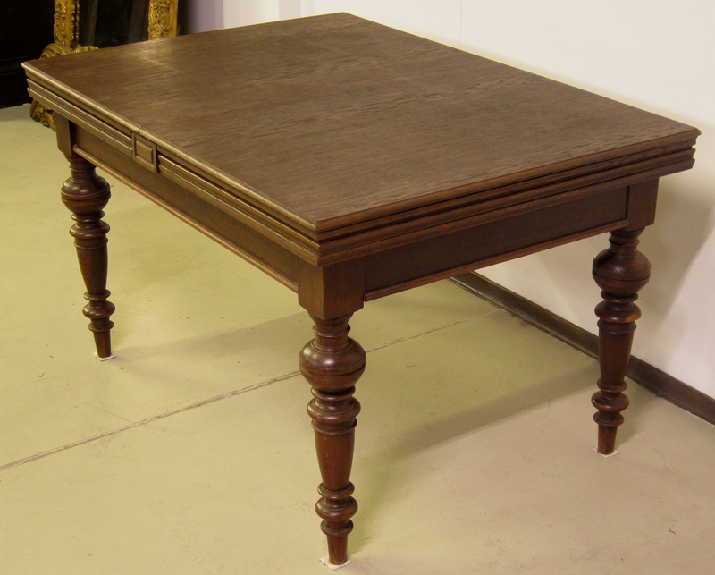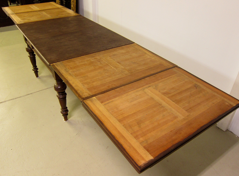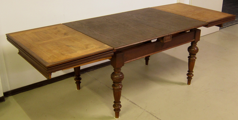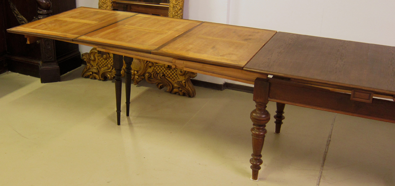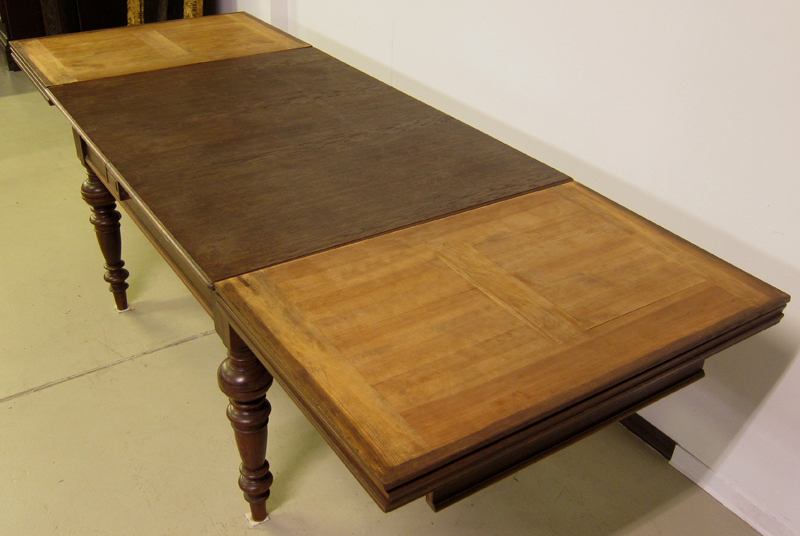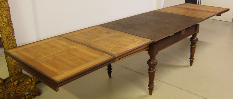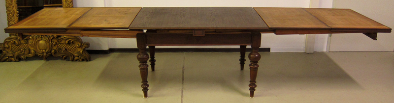 Hervorzuheben sind die wundervoll gedrechselten Balusterbeine, die schön profilierten Zargen und das ansprechende Furnierbild. Desweiteren kann der Tisch auf das Mehrfache seiner Ursprungslänge ausgezogen werden. Auf fast vier Metern finden bis zu 18 Personen bequem Platz. Die zusätzlichen Beine verleihen dem Tisch die nötige Stabilität.
