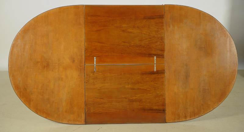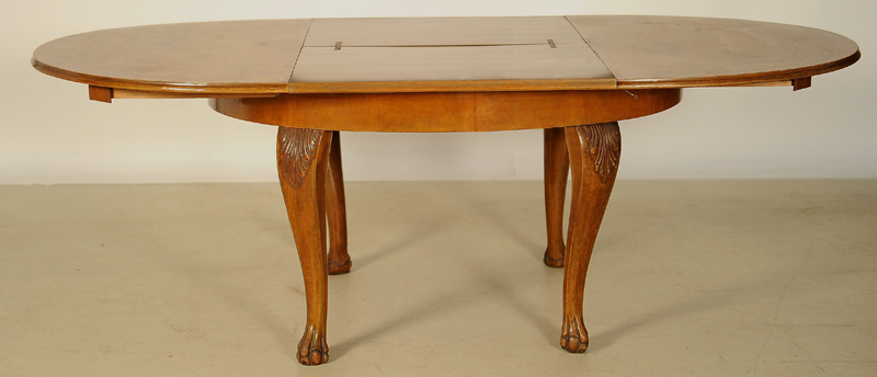 Hier bieten wir Ihnen eine kolossalen Auszugstisch, der um 1910 aus bestem Nussbaum, massiv und furniert, gefertigt wurde und durch seine ovale Form und höchste Qualität besticht.