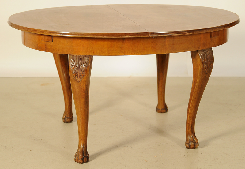 Besonders hervorzuheben sind die tollen Löwentatzenfüße, und die leicht geschwungenen Beine mit geschnitzten Verzierungen. Da der Tisch auf 2,30 Meter auszuziehen ist, bietet er auch einer größeren Abendgesellschaft bequem Platz. Die Einlegeplatten werden praktischerweise im Tisch versenkt.
