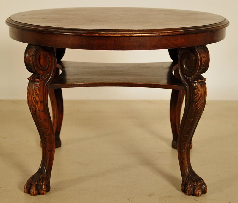 Hier bieten Sie auf einen stilvollen Beistelltisch aus der Neorenaissance, gefertigt um 1930 aus feinstem Nussbaum, massiv und furniert. Seine runde Deckplatte ist mehrfach profiliert, die vier elegant geschwungenen Beine wurden mit schön geschnitzten Appliken in Form stilisierter Blattranken verziert und mit eindrucksvollen Tatzenfüßen versehen. Das schön gemaserte Furnier wird durch den warmen Ton anmutig hervorgehoben.