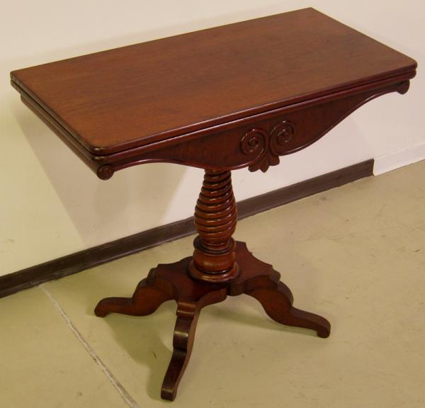 Die Deckplatte mit den runden Kanten, bei der die wundervolle Maserung des Holzes sehr eindrucksvoll zur Geltung kommt, lässt sich zusammenklappen und über eine 90°Drehung auf die darunterliegende Schublade legen. Die Zarge mit geschneckten Seitenwülsten und der Front, das wundervoll gedrehte Säulenbein sowie die vier geschwungenen Beine sind weitere auffällige Stilmerkmale.