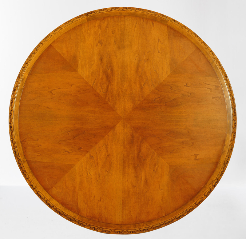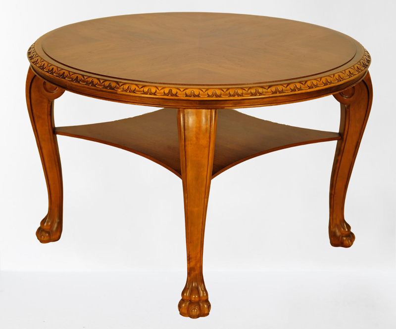 Der runde Tisch mit überzeugt neben seinem stilvollen Design besonders durch seine Schnitzereien an der Deckplatte, der aufwändigen großen Tatzenfüße und der geschwungenen Beine mit Schuppenfries und geschneckten Abschlüssen. Die Deckplatte des Tisches mit wunderschönem Furnierbild werden durch eine Glasplatte geschützt. Unterhalb der Deckplatte ist eine praktische Ablage angebracht.
