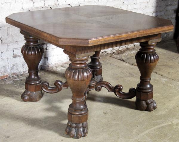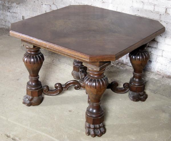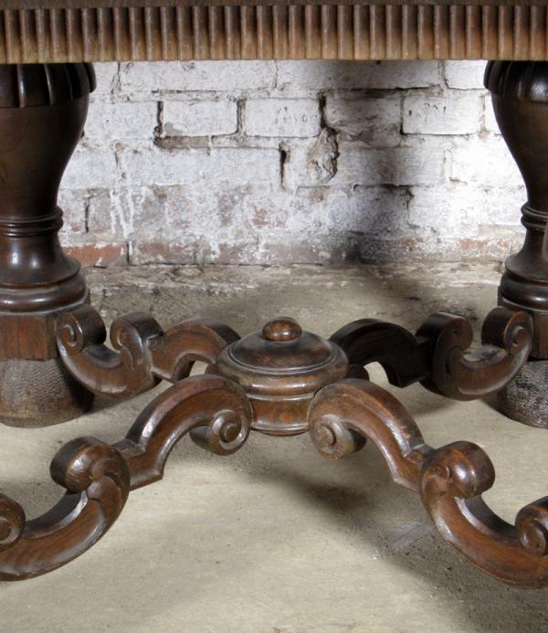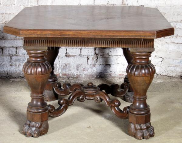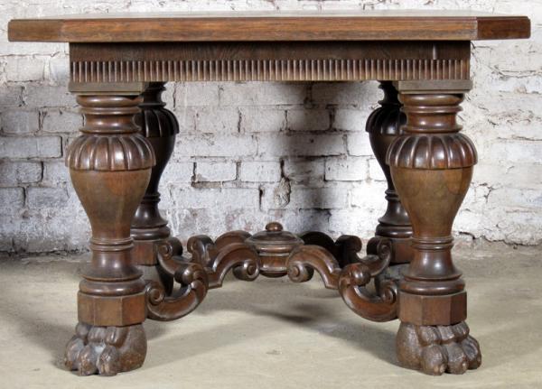 Besonders hervorzuheben sind dabei die vier dicken Säulenbeine mit kubischen Basen, das verzierte Fußkreuz mit geschneckten, stilisierten Blattranken, die längsseitig fein kannelierte Zarge unterhalb der kunstvoll im Rautenmuster furnierten Deckplatte sowie die auffallenden Tatzenfüße.