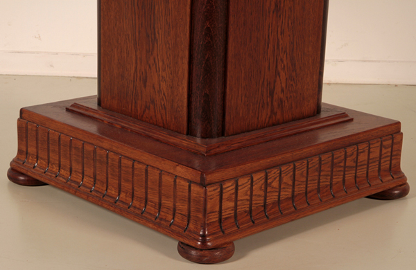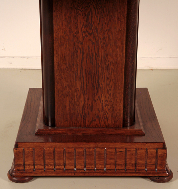 Besonders hervorzuheben ist das wunderschöne Furnierbild der Deckplatte mit elegantem Fries sowie der breite viereckige Fuß mit Bänderung und den vier Tatzenfüßen.