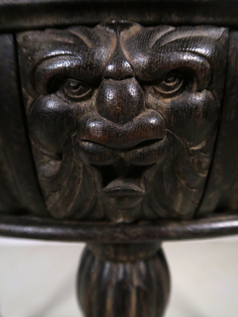 Besonders bemerkenswert sind die vier geschnitzten Löwenköpfe in der Zarge und die schmalen gedrechselten Beine.