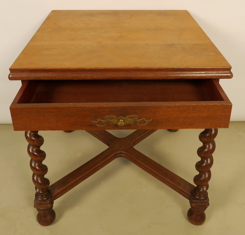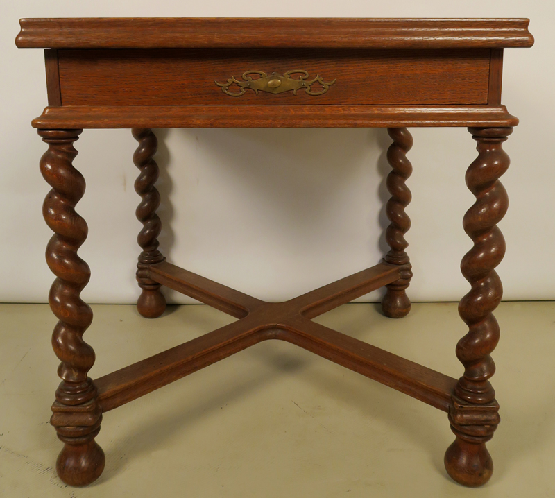Besonders bemerkenswert hierbei sind die massiven Zopfsäulen und das solide Fußkreuz sowie der schöne originale Beschlag der praktischen großen Schublade.