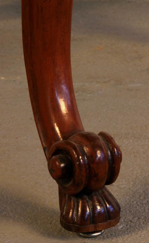 Im Einzelnen hervorzuheben sind dabei die in die Zarge an den Kopfseiten und je links und rechts neben den Beinen eingeschnitzten Blüten mit floralem Beiwerk sowie die wundervoll aus den massiven Beinen herausgearbeiteten plastischen Blüten mit großen Blätern. Weiterhin erwähnenswert ist das zauberhafte Furnierbild mit der typischen intensiven Maserung und den ins rötliche stechenden Brauntönen.