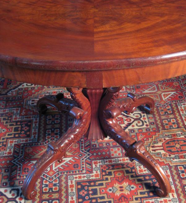 Unglaublicher Esstisch aus der Spätbiedermeierzeit der besonders durch seinen geschnitzten Fuß zu begeistern weiß. Der Tisch wurde um 1850 aus feinstem Mahagoniholz, massiv und furniert, gefertigt.