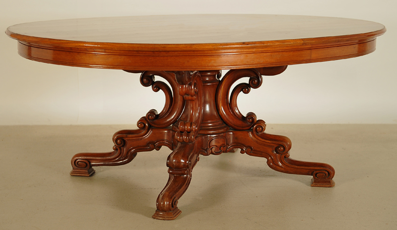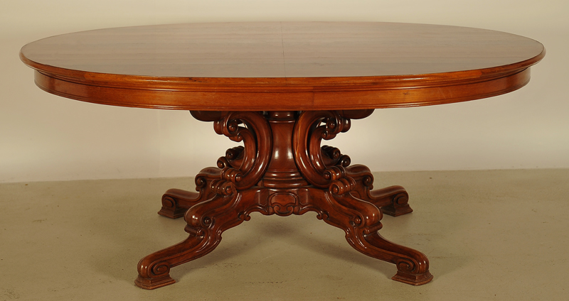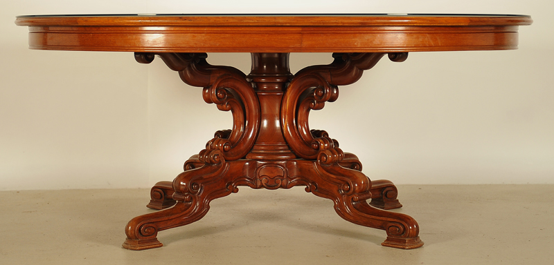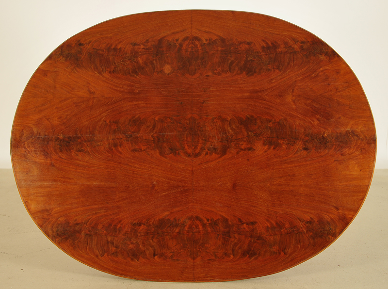 Besonders hervorzuheben ist das meisterlich profileirte Fußkreuz mit volutierenden Abschlüssen und mittiger Säule, die profilierte Tischplatte mit abgesetzter Zarge sowie das traumhafte Funierbild in schönster Maserung und rotbraunem Farbton.