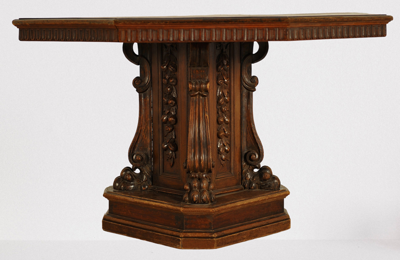 Die profilierte Deckplatte mit umlaufendem Fries und schönem Furnierbild ist dabei ebenso hervorzuheben wie das ebenfalls, mehrfach profilierte Podest. Auf dieses stützen sich vier fein herausgeschnitzte Tatzenfüße mit ionisierten Pilastern sowie dazwischengesetztem Zierwerk in Form floraler Ornamentik.