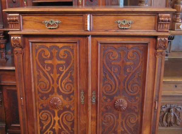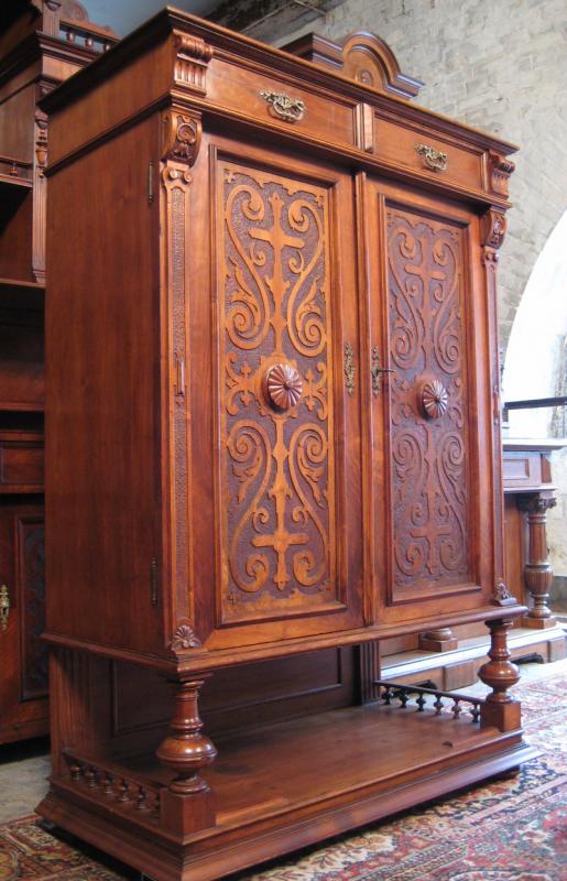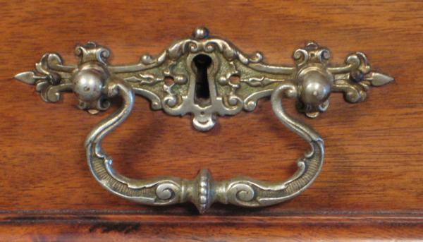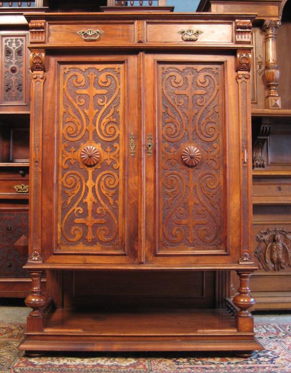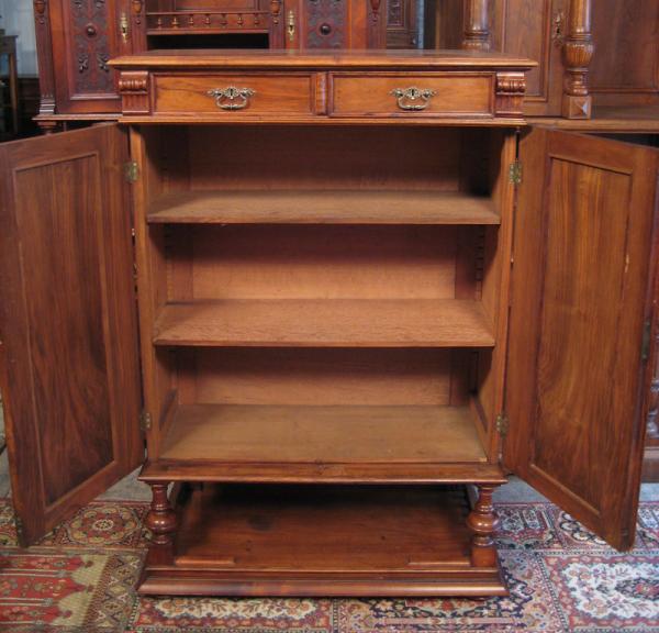 Besonders hervorzuheben sind die Pilaster mit kleinen geschnitzten Muscheln, die wahnsinnigen Türfüllungen mit mittig angeordneter Rosette, die zierlich diamantierte Schlagleiste, der formschöne Stollenunterbau mit gedrechselten Balustersäulen und galerieartigem Seitenrand sowie die stilvollen Originalbeschläge.