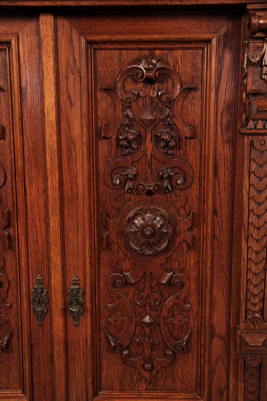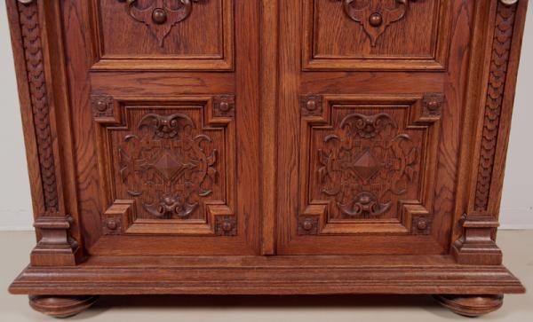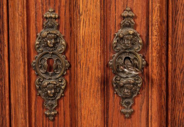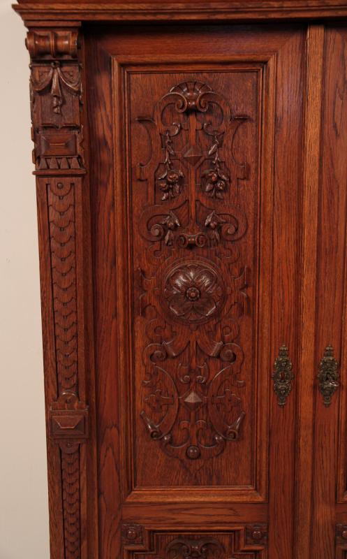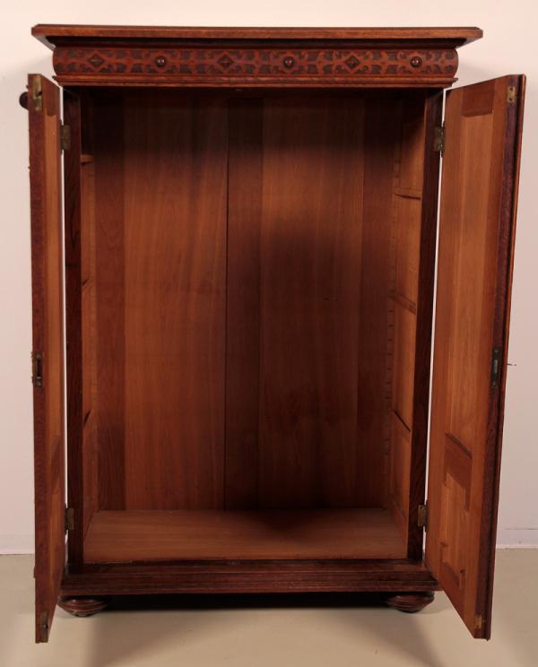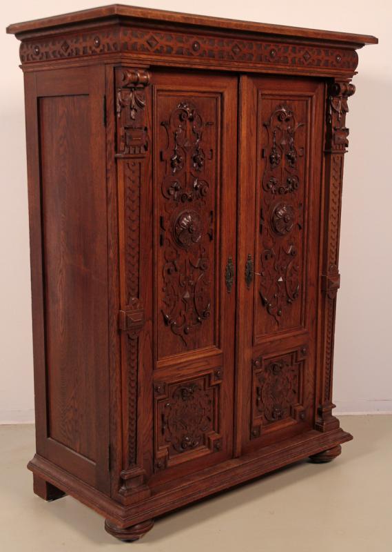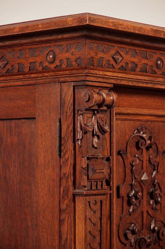 Die klare Linienführung lenkt den Blick schnell auf die mit Schuppenfries besetzten Pilaster und ihre aufwändigen Kapitelle sowie auf die fantastischen Füllungen der kassettierten Türen. Diese zeigen eine wundervoll plastisch herausgeschnitzte florale Ornamentik mit kleinen Roncaille-Elementen am Kopfende und mittigen großen Rosetten. Diamantierungen, gedrückte und profilierte Kugelfüße sowie ein mit breitem Fries besetztes Gesims sind weitere Besonderheiten dieses Möbels. Das Innenleben weist eine Vorrichtung für Einlegeböden auf.