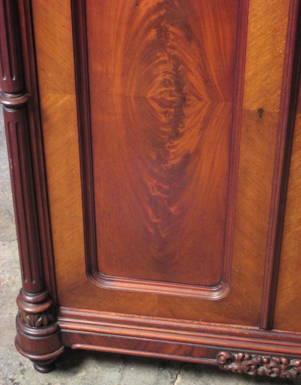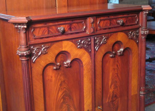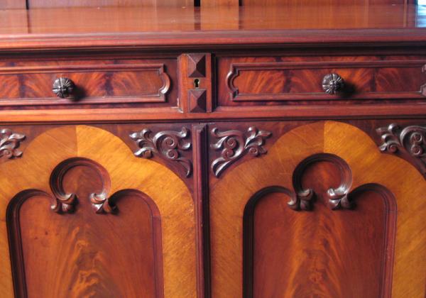 Besonders auffallend sind die gotisierenden und geschnitzten Kassettierungen der Türen, das markante Furnierbild in unterschiedlichen Farbtönen und Textur, die kannelierten Balustersäulen mit handgeschnitzten Kapitellen und Basen, die profilierte Deckplatte und Schlagleiste, die untere Zarge mit geschnitzter Applikation sowie die kleinen Diamantierungen zwischen den beiden Schubladen.