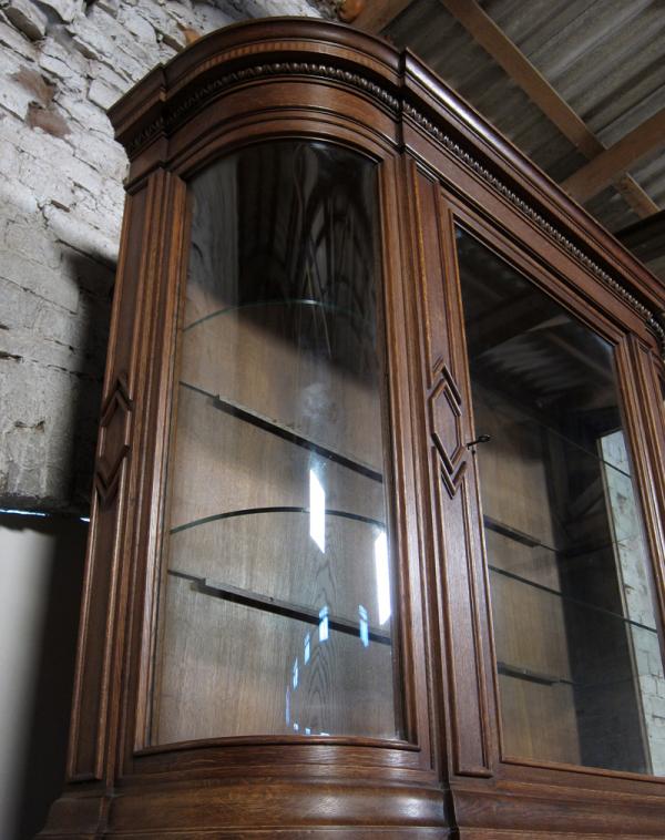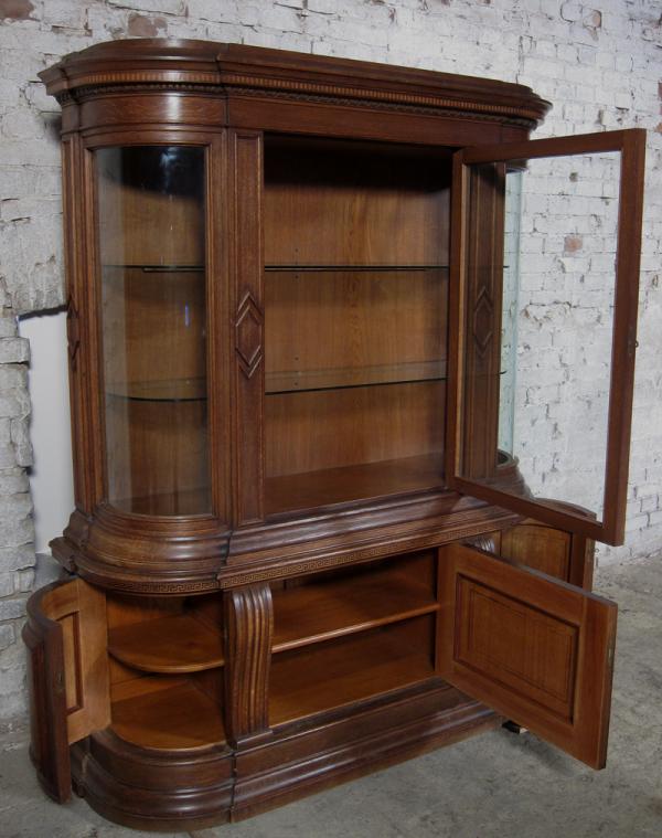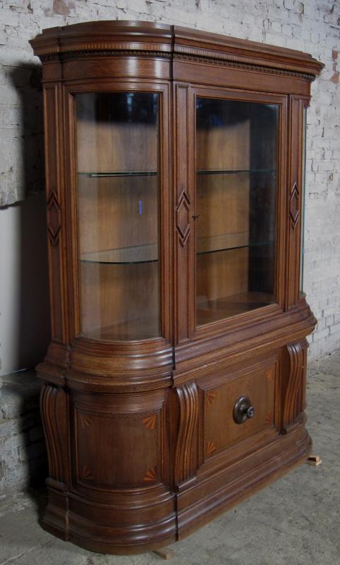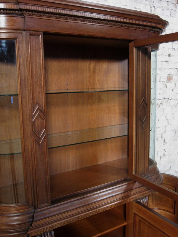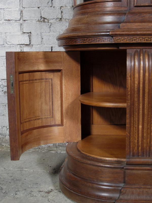 Hier bieten wir Ihnen einen beeindruckenden Vitrinenschrank welcher durch seine schwere Ausführung kombiniert mit filigranen Details zu einem ausdrucksstarken Exponat seiner Zeit. Gefertigt wurde dieses Möbel um 1910 aus bester Eiche, massiv und furniert.