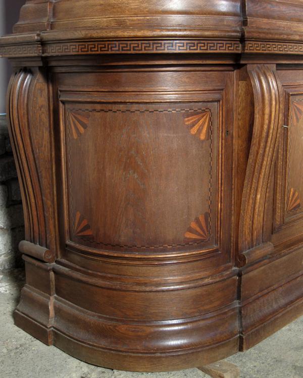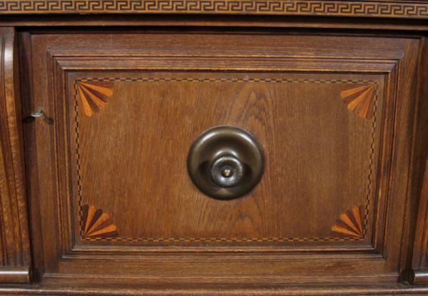Der Unterbau wird von den heraustretenden, rund kannelierten Pilastern bestimmt. Die zart kassettierten Türen weisen an ihren vier Ecken jeweils schön intarsierte Fächer auf. Der Griff der mittigen Tür besteht aus einer dunklen, glatten Rosette mit kleinem Knauf.