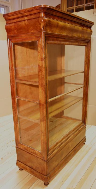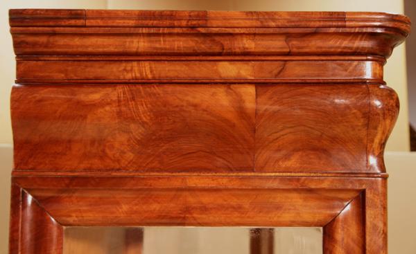 Die klare Grundform des Korpus wird von dem hervorgewölbten Gesims unterbrochen. Dieses Stilmerkmal findet sich in abgeschwächter Form auch in der unteren Zarge wieder. Ein Highlight bildet das schön polierte Furnierbild, das sich durch die intensive Maserung und die verschiedenen Farbtönen auszeichnet. Die kassettierte Tür und die Seiten, die von einer zarten Schlagleiste unterteilt werden, richten den Blick auf das innere der Vitrine in der sich zwei helle Einlegeböden befinden.