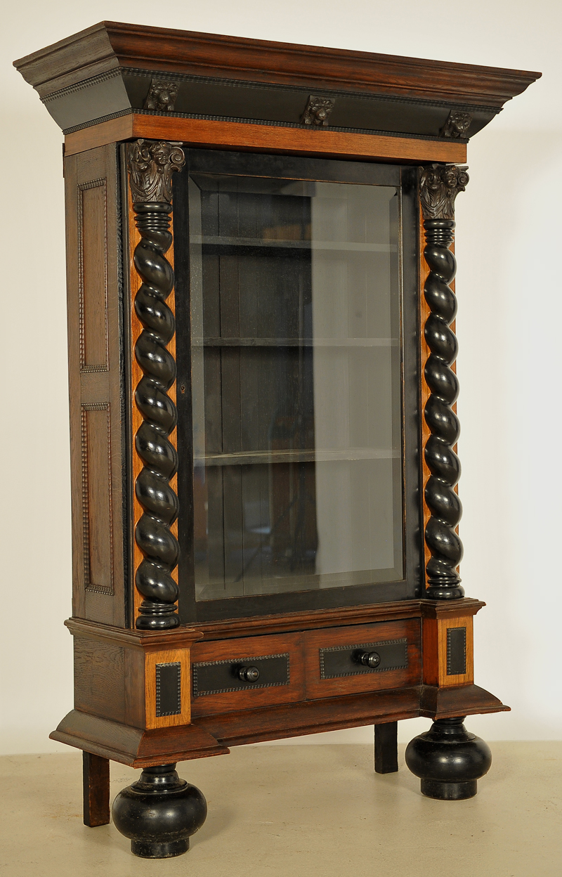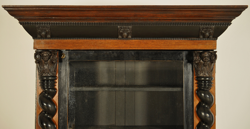 Besonders hervorzuheben sind die ebonisierten, massiven gedrechselten Säulen mit figürlichen Kapitellen. Die kleinen Puttenköpfe zeichnen sich durch ihr meisterliches Schnitzwerk und feinen Details aus. Das weit auskragende Gesims wird ebenfalls von einem ebonisierten Element geschmückt, das darüber hinaus noch drei imposante Löwenköpfe beherbergt. Die Seiten der Vitrine sind zweifach kassettiert, die Profilierungen schmuckvoll gestaltet. Das Unterteil mit seinen zwei kleinen Türen wird durch die riesenhaften kugelförmigen Füße gehalten.
