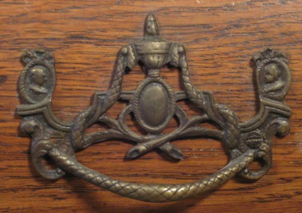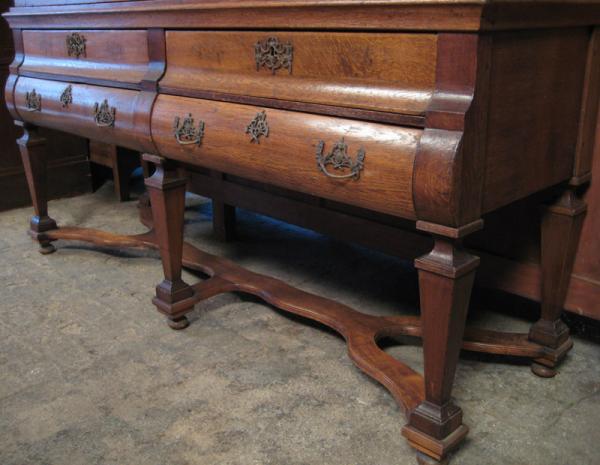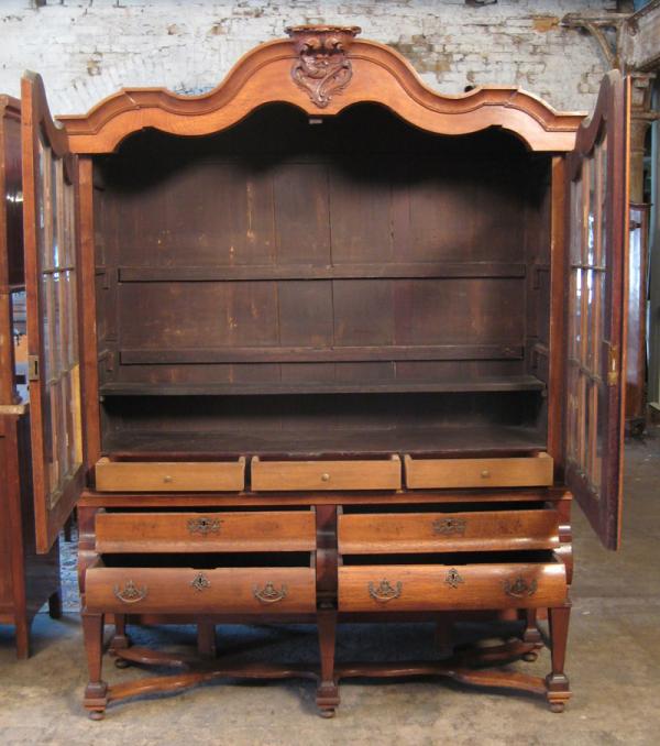 Besonders hervorzuheben sind die meisterlich geschnitzte Bekrönung, die von Zierleisten unterteilten Glastüren, die vier gewölbten Schubladen mit fantastischen Originalbeschlägen sowie dem Stollenunterbau mit geschwungenem Fußkreuz. Unbeschreiblich ist die erhabene Patina, die dem hohen Alter des Möbels Rechnung trägt!