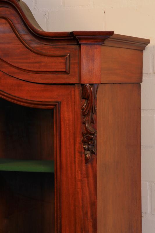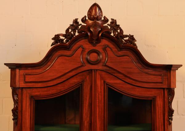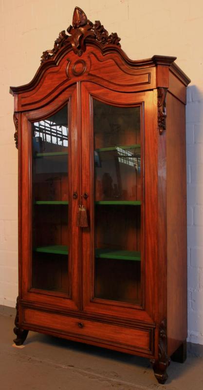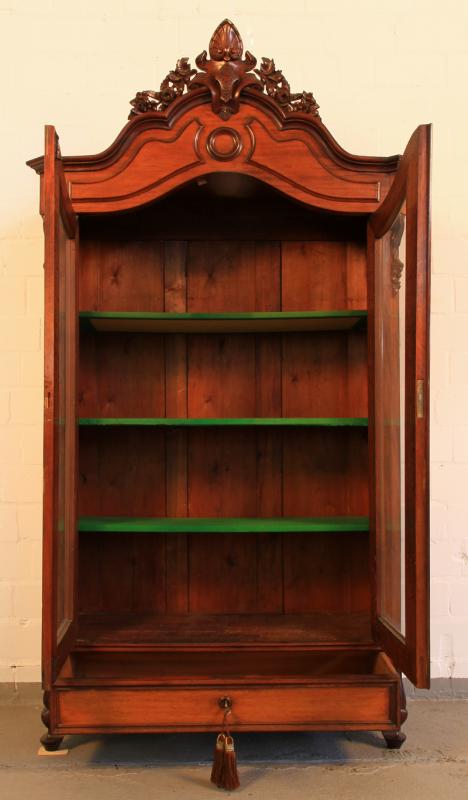 Ins Auge sticht natürlich sofort die markante Bekrönung des geschweiften Giebels mit mittigem Roncaille-Element und floraler Ornamentik in plastischem Schnitzwerk. Die zarten Kapitelle und Basen nehmen dieses Motiv wieder auf und führen den Blick am hoch aufgeschossenen Möbel entlang. Die Glastüren sind ebenfalls elegant geschwungen und dazu mehrfach profiliert, gleiches gilt für die unten befindliche Schublade. Im Inneren bieten drei Einlegeböden Platz für die Präsentation und Aufbewahrung Ihrer Schätze.