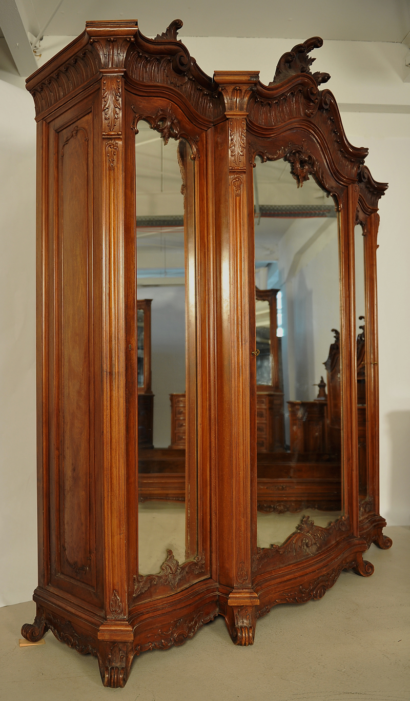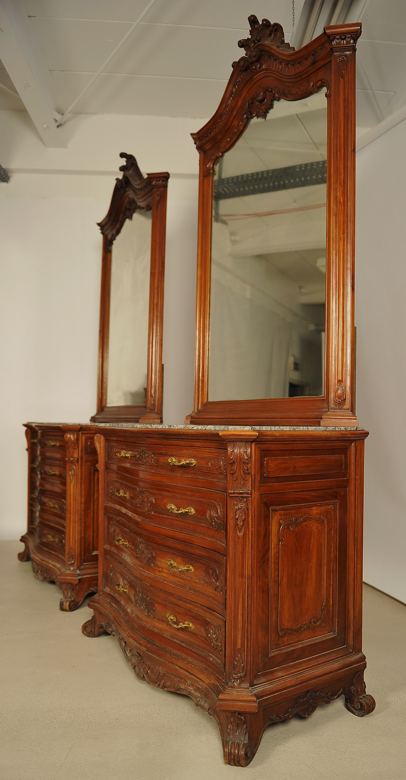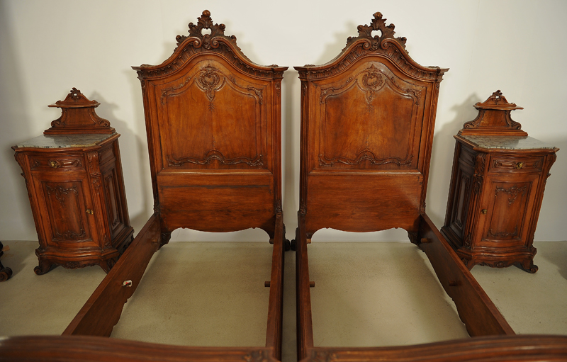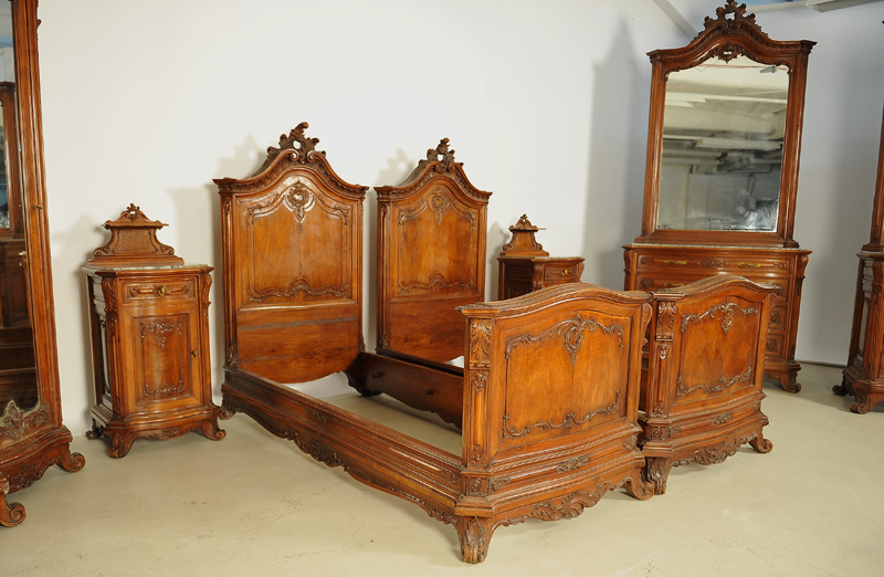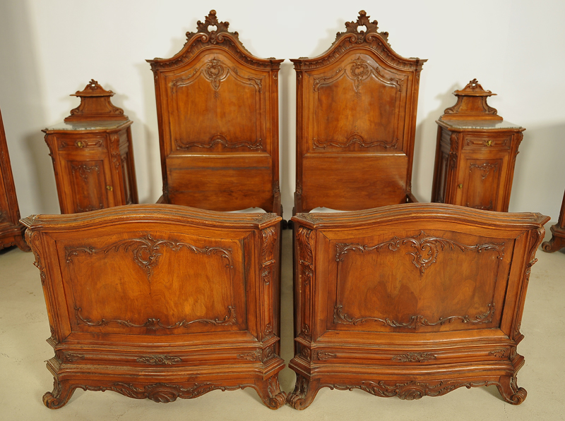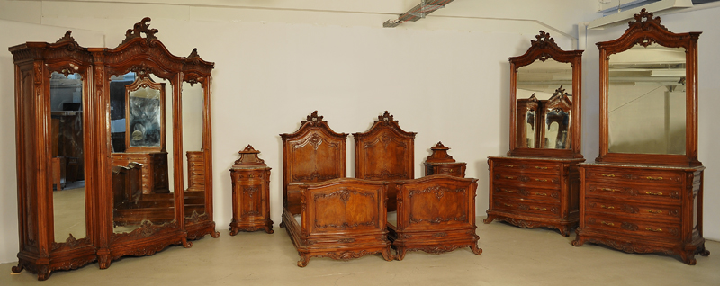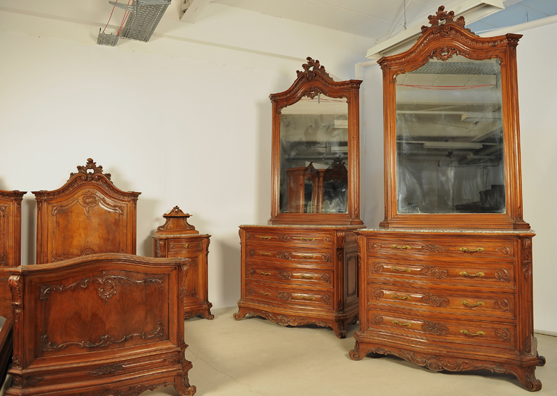 Hier können wir Ihnen ein unglaubliches Schlafzimmer anbieten, das durch seine einzigartige Herrschaftlichkeit jeder Schlosseinrichtung zur Ehre gereichen würde. Es wurde um 1880 aus schönstem Nussbaum, massiv und furniert, gefertigt und bezaubert durch die unvergleichliche, dem Neorokoko so typische, prunkvolle und erhabene Gestaltung. Seine bewegten Konturen, geschwungene und geschweifte Formen mit reicher Ausschmückung machen es zum Inbegriff des höfischen Stils.