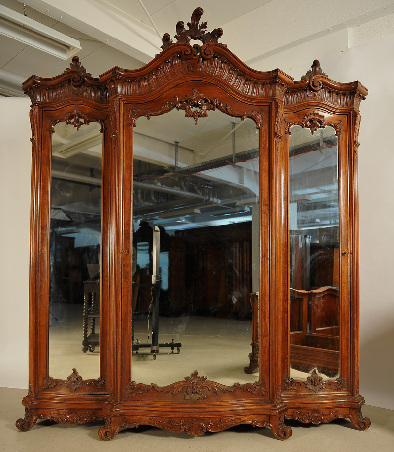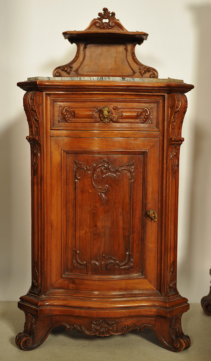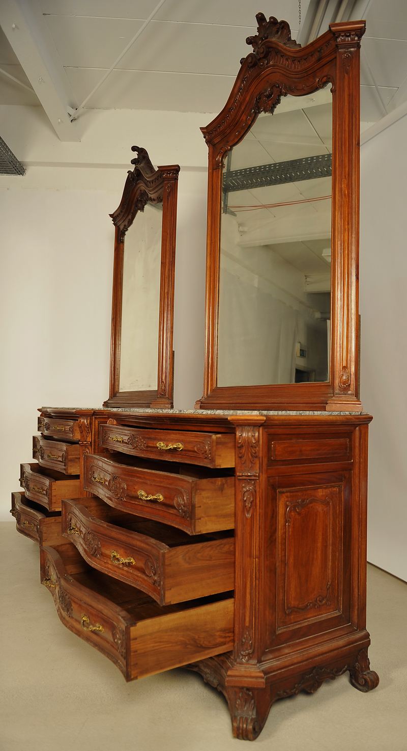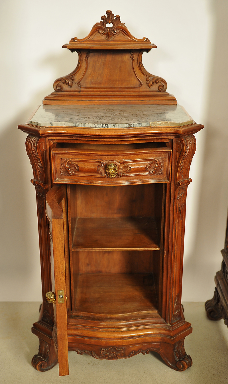 Jedes Möbelstück ist mit einer fantastischen Krone geschmückt, meisterlich geschnitzt, mit naturalistischen Motiven wie Blattranken versehen und ausladend herausgestellt, der Kleiderschrank hat dabei auch an den Seiten kronenähnliche Abschlüsse. Besonders Erwähnenswert ist das schwere bronzene Beschlagwerk mit Bronzeköpfen als Knauf an den Nachtschränken sowie die schönen Marmorplatten auf den Kommoden und Nachttischen.