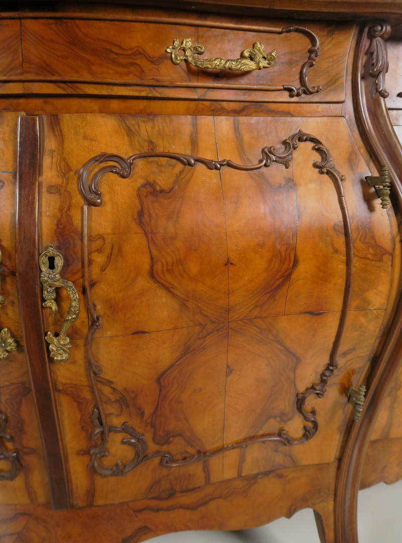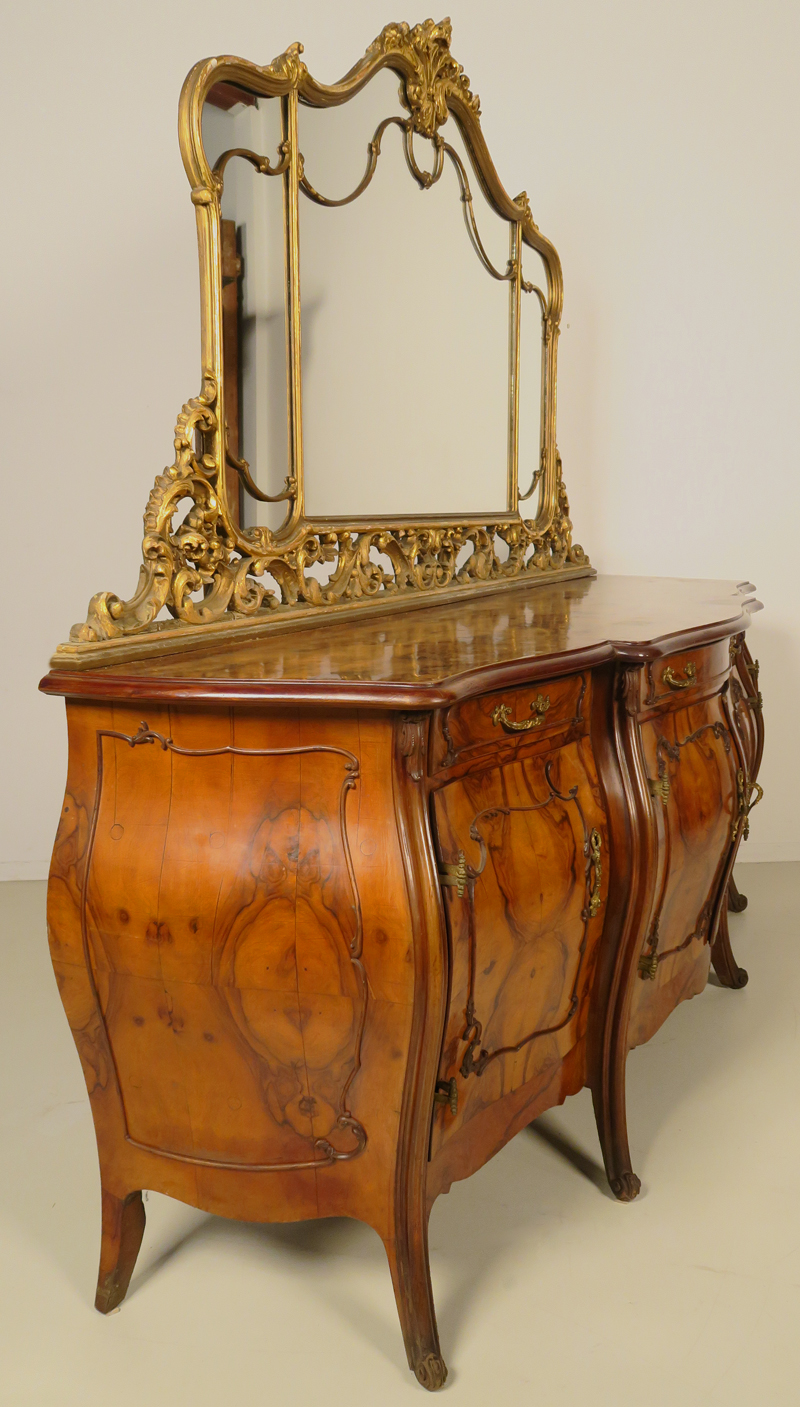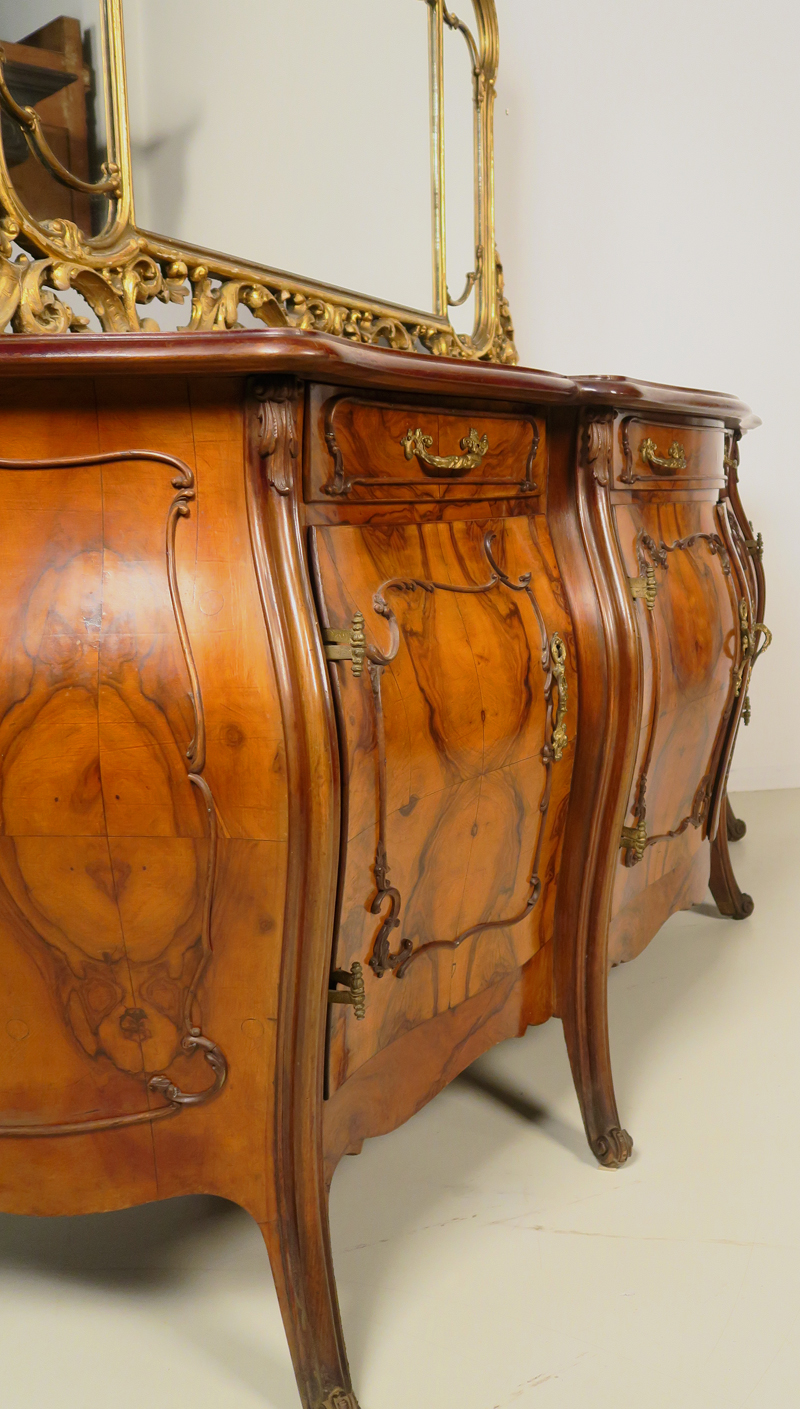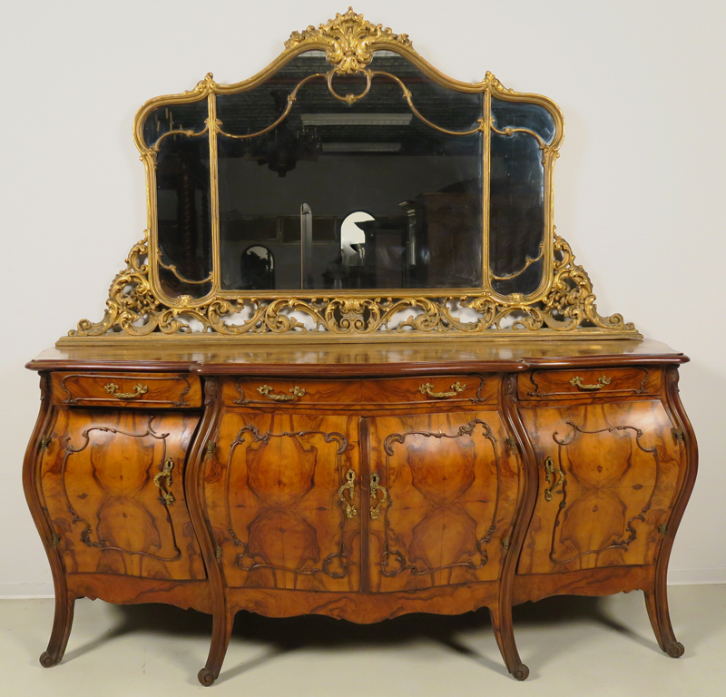 Die Kredenzen bilden das repräsentative Herzstück, ihre filigran handgeschnitzten und vergoldeten Spiegel mit ausschweifenden Kronen haben eine unglaubliche Ausstrahlung. Der Korpus ist bombiert und geschweift, diese Dynamik wird durch das interessante Nusswurzelfurnier mit traumhafter Maserung sehenswert unterstützt. Die originalen Beschläge der Schübe sowie das hochwertig gestaltete Innenleben runden die herrschaftliche Gesamterscheinung ab.