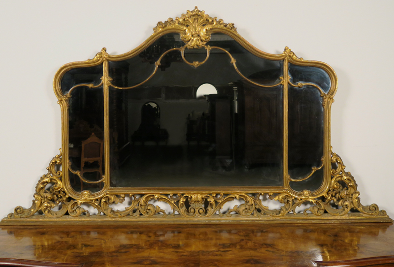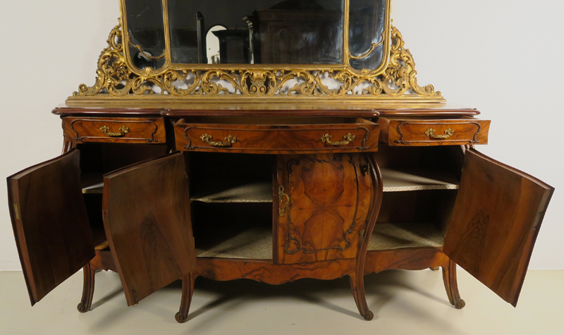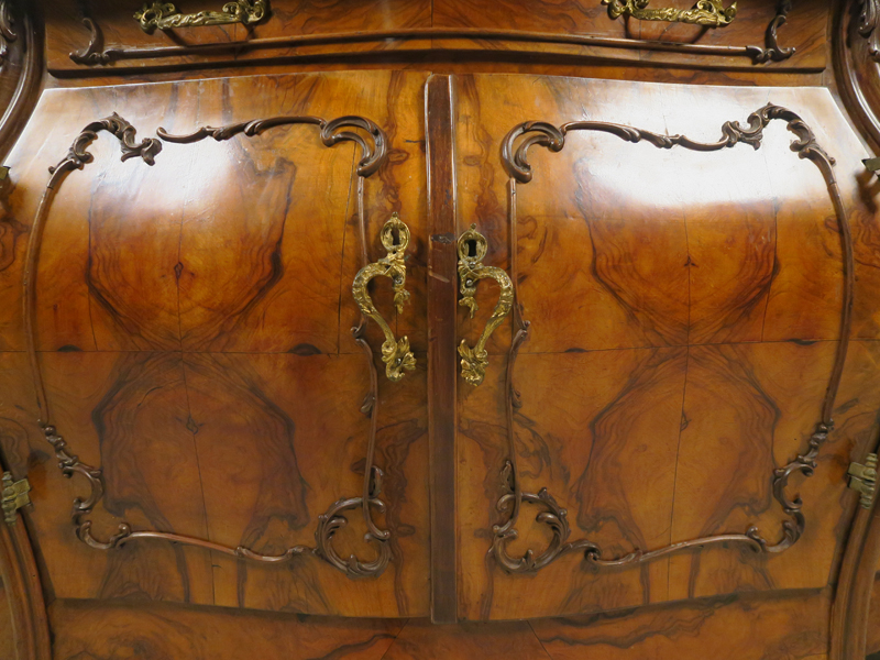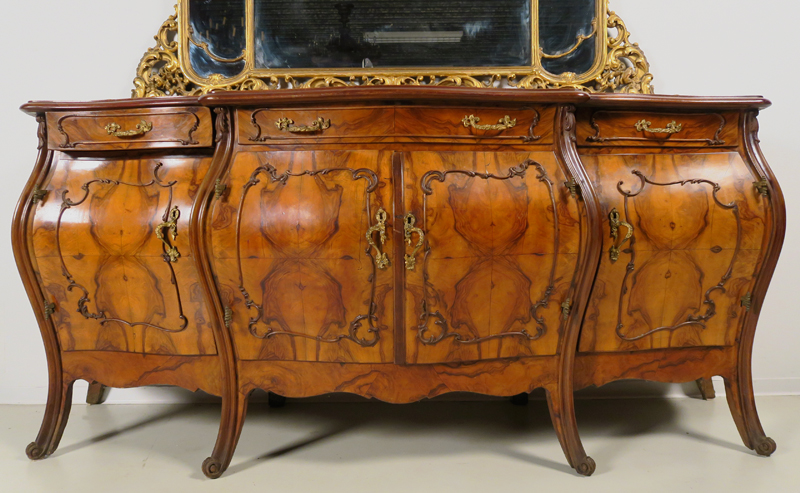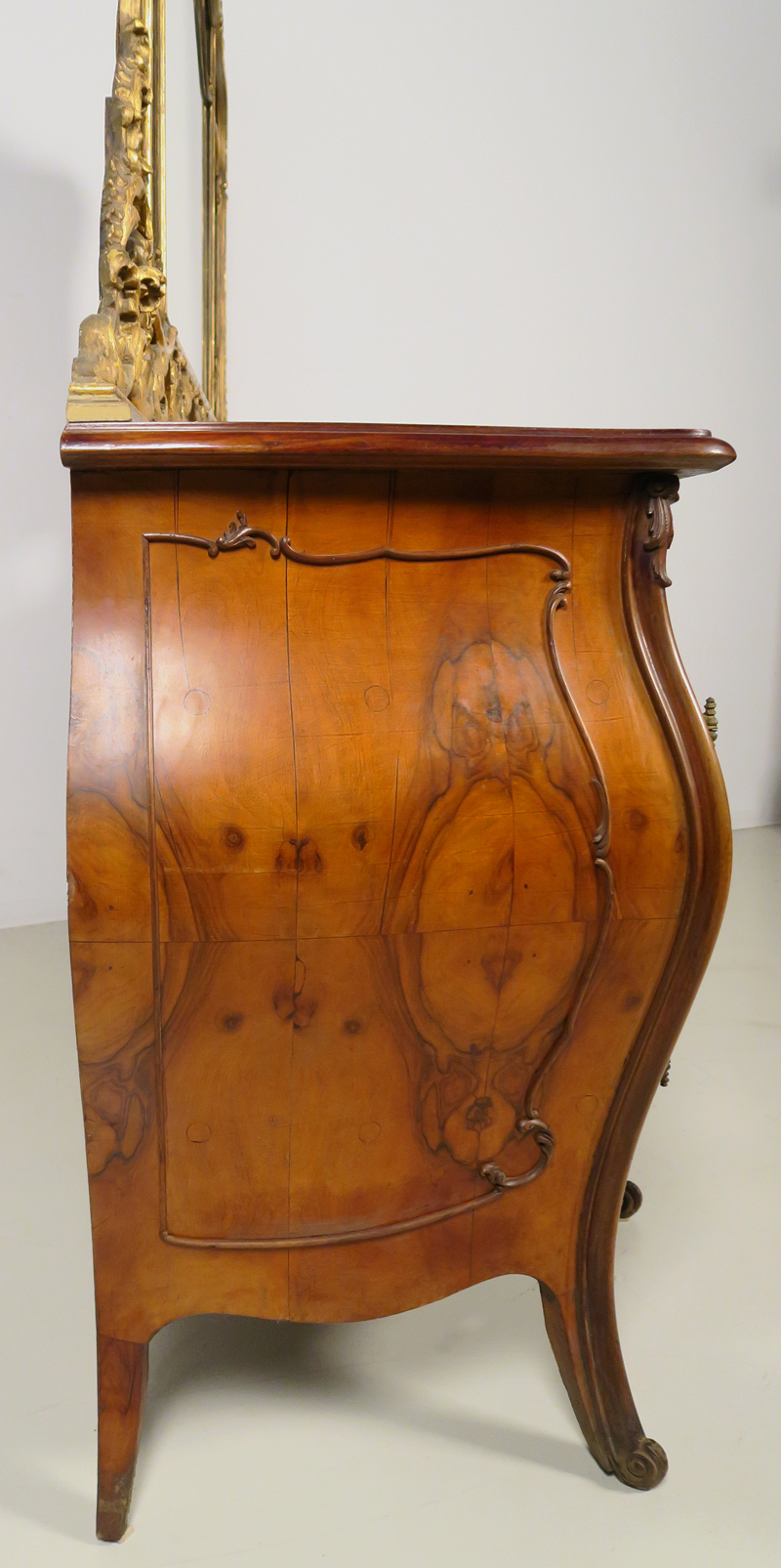 Die Kredenzen bilden das repräsentative Herzstück, ihre filigran handgeschnitzten und vergoldeten Spiegel mit ausschweifenden Kronen haben eine unglaubliche Ausstrahlung. Der Korpus ist bombiert und geschweift, diese Dynamik wird durch das interessante Nusswurzelfurnier mit traumhafter Maserung sehenswert unterstützt. Die originalen Beschläge der Schübe sowie das hochwertig gestaltete Innenleben runden die herrschaftliche Gesamterscheinung ab.