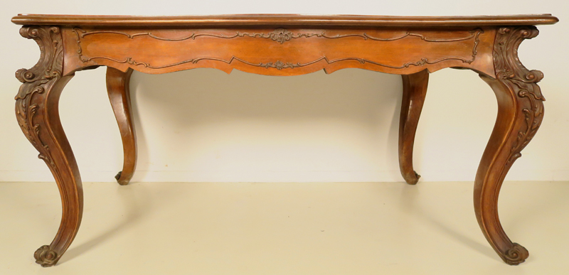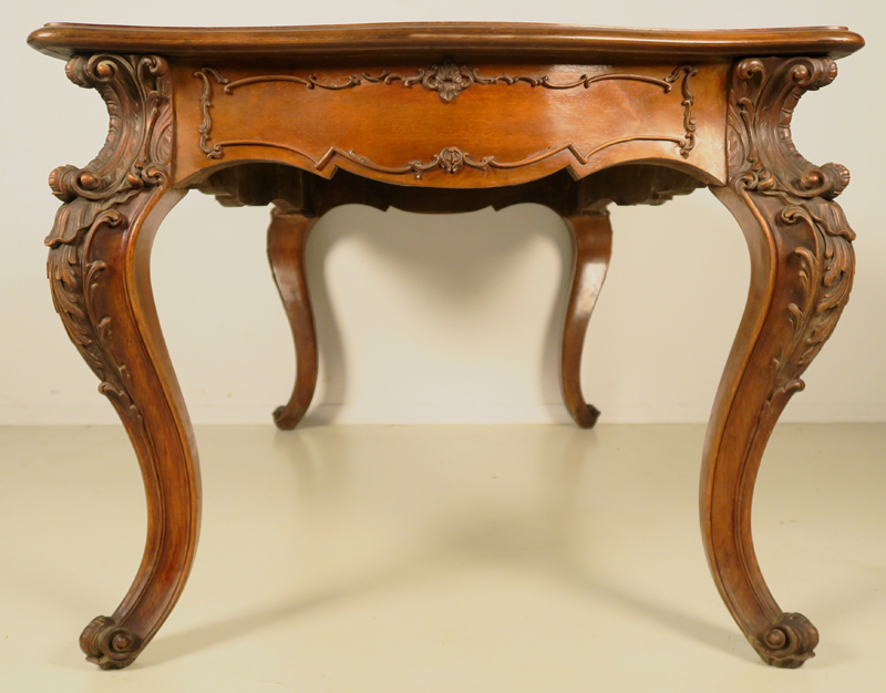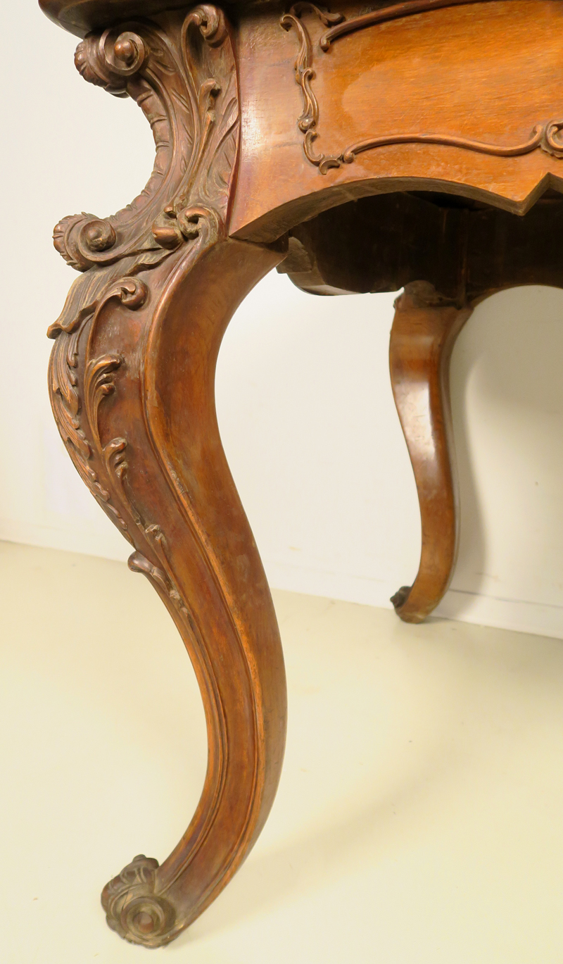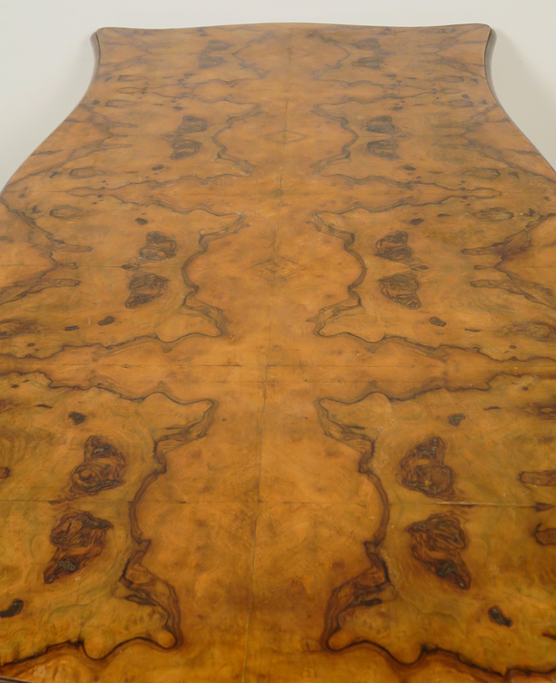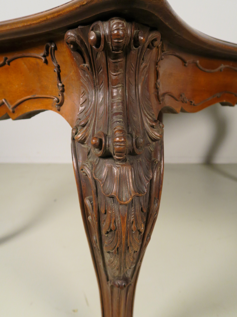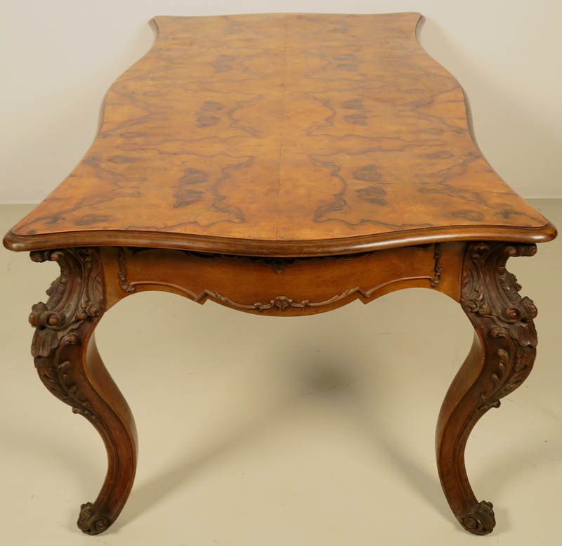 Der Tisch führt die elegante Linie der Kredenzen nahtlos fort, geschwungene Beine, kleine geschnitzte Verzierungen sowie die Deckplatte mit schöner Maserung sind hier die herausragenden Merkmale.